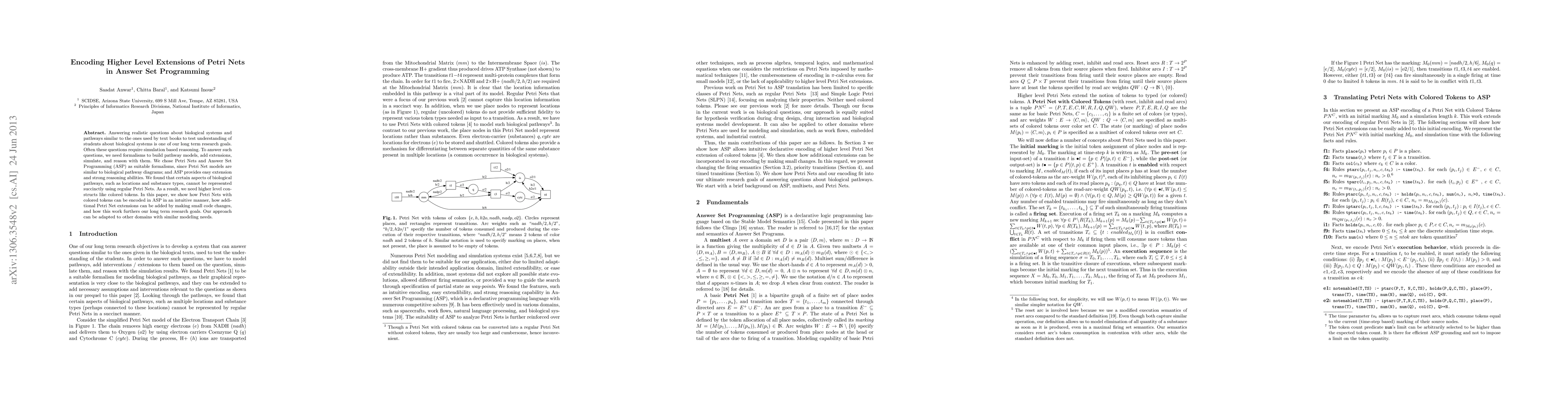 Answering realistic questions about biological systems and pathways similar to the ones used by text books to test understanding of students about biological systems is one of our long term research goals. Often these questions require simulation based reasoning. To answer such questions, we need formalisms to build pathway models, add extensions, simulate, and reason with them. We chose Petri Nets and Answer Set Programming (ASP) as suitable formalisms, since Petri Net models are similar to biological pathway diagrams; and ASP provides easy extension and strong reasoning abilities. We found that certain aspects of biological pathways, such as locations and substance types, cannot be represented succinctly using regular Petri Nets. As a result, we need higher level constructs like colored tokens. In this paper, we show how Petri Nets with colored tokens can be encoded in ASP in an intuitive manner, how additional Petri Net extensions can be added by making small code changes, and how this work furthers our long term research goals. Our approach can be adapted to other domains with similar modeling needs.