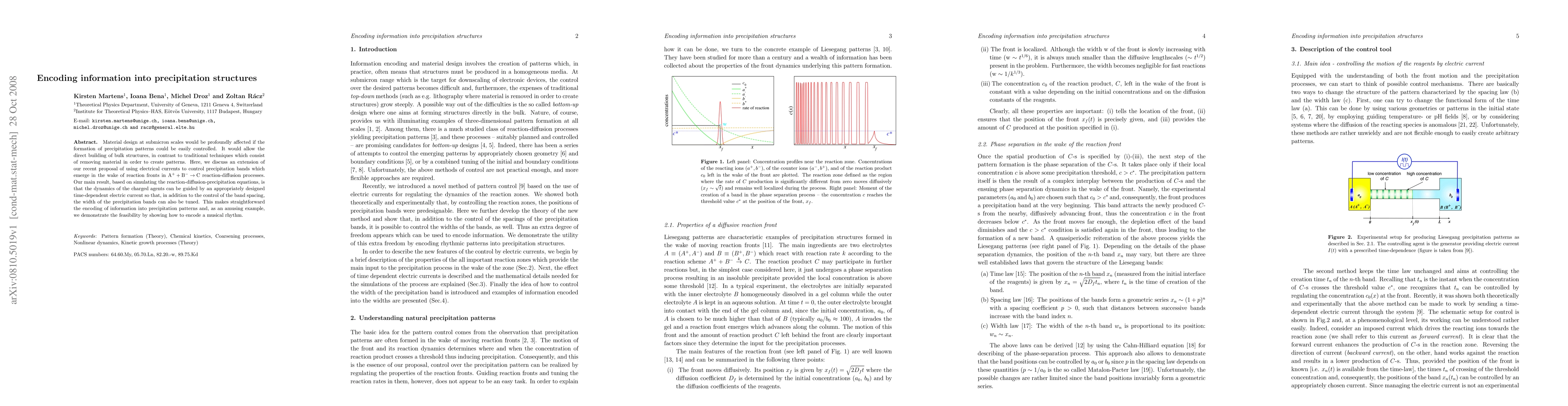 Material design at submicron scales would be profoundly affected if the formation of precipitation patterns could be easily controlled. It would allow the direct building of bulk structures, in contrast to traditional techniques which consist of removing material in order to create patterns. Here, we discuss an extension of our recent proposal of using electrical currents to control precipitation bands which emerge in the wake of reaction fronts in A^{+} + B^{-} -> C reaction-diffusion processes. Our main result, based on simulating the reaction-diffusion-precipitation equations, is that the dynamics of the charged agents can be guided by an appropriately designed time-dependent electric current so that, in addition to the control of the band spacing, the width of the precipitation bands can also be tuned. This makes straightforward the encoding of information into precipitation patterns and, as an amusing example, we demonstrate the feasibility by showing how to encode a musical rhythm.