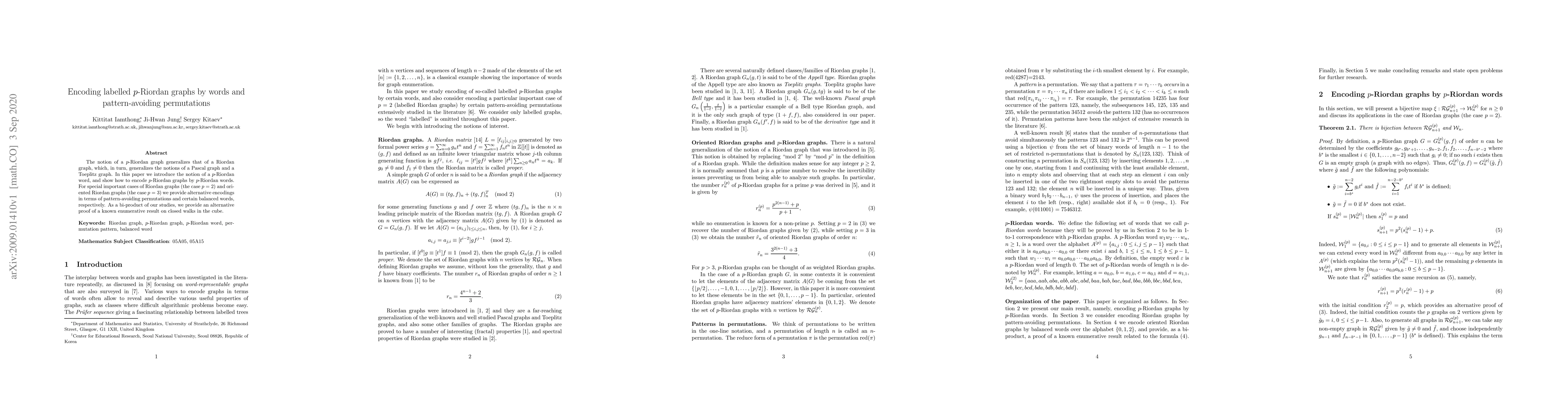 The notion of a $p$-Riordan graph generalizes that of a Riordan graph, which, in turn, generalizes the notions of a Pascal graph and a Toeplitz graph. In this paper we introduce the notion of a $p$-Riordan word, and show how to encode $p$-Riordan graphs by $p$-Riordan words. For special important cases of Riordan graphs (the case $p=2$) and oriented Riordan graphs (the case $p=3$) we provide alternative encodings in terms of pattern-avoiding permutations and certain balanced words, respectively. As a bi-product of our studies, we provide an alternative proof of a known enumerative result on closed walks in the cube.