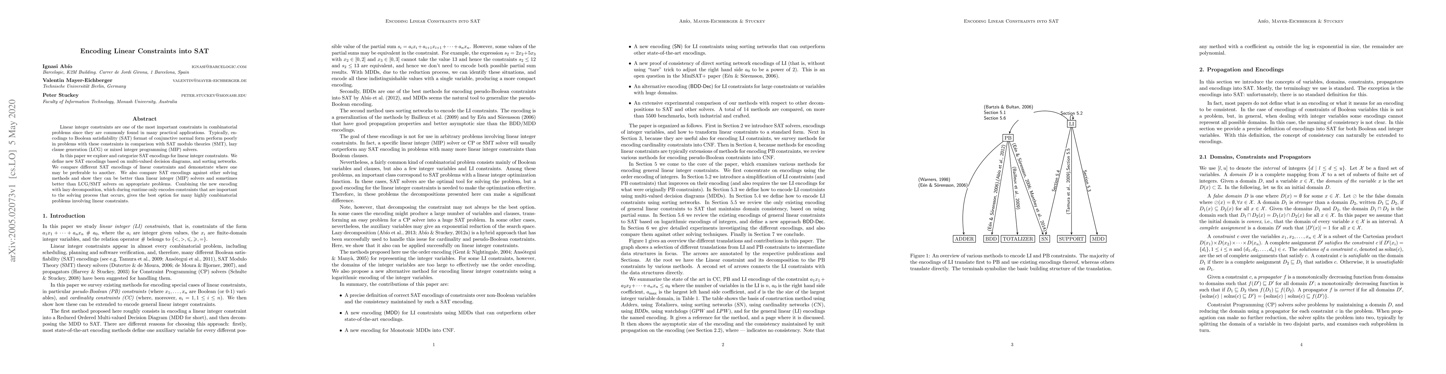 This paper explores various SAT encodings for linear integer constraints, introducing new encodings based on multi-valued decision diagrams and sorting networks. It compares these encodings to SMT, LCG, and MIP solvers, demonstrating that certain SAT encodings outperform MIP solvers and can be competitive with LCG or SMT solvers, especially when combined with lazy decomposition.