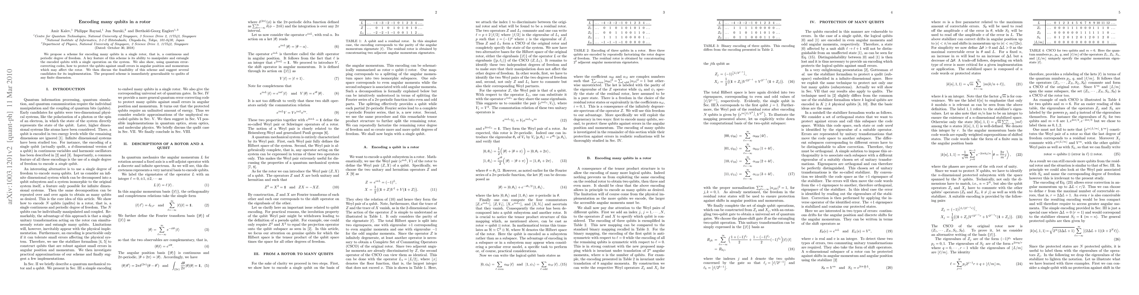We propose a scheme for encoding many qubits in a single rotor, that is, a continuous and periodic degree of freedom. A key feature of this scheme is its ability to manipulate and entangle the encoded qubits with a single operation on the system. We also show, using quantum error-correcting codes, how to protect the qubits against small errors in angular position and momentum which may affect the rotor. We then discuss the feasibility of this scheme and suggest several candidates for its implementation. The proposed scheme is immediately generalizable to qudits of any finite dimension.