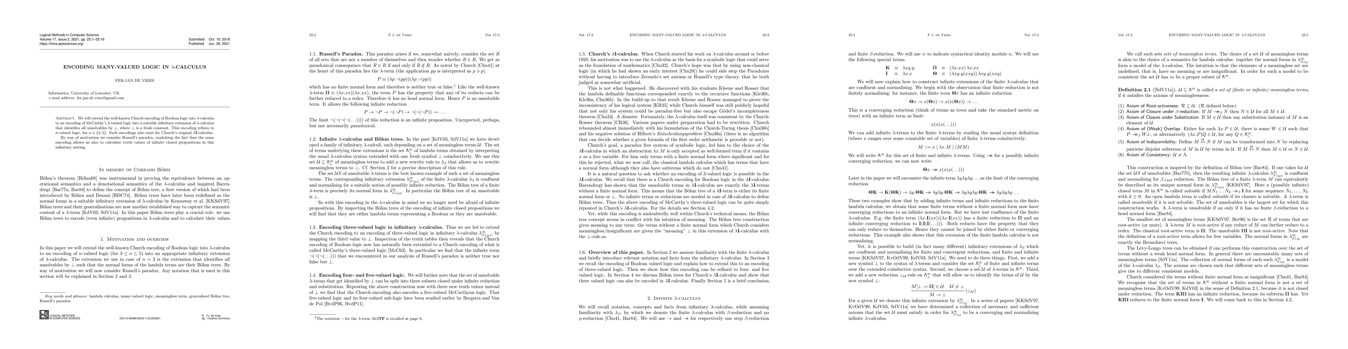 We will extend the well-known Church encoding of Boolean logic into $\lambda$-calculus to an encoding of McCarthy's $3$-valued logic into a suitable infinitary extension of $\lambda$-calculus that identifies all unsolvables by $\bot$, where $\bot$ is a fresh constant. This encoding refines to $n$-valued logic for $n\in\{4,5\}$. Such encodings also exist for Church's original $\lambda\mathbf{I}$-calculus. By way of motivation we consider Russell's paradox, exploiting the fact that the same encoding allows us also to calculate truth values of infinite closed propositions in this infinitary setting.