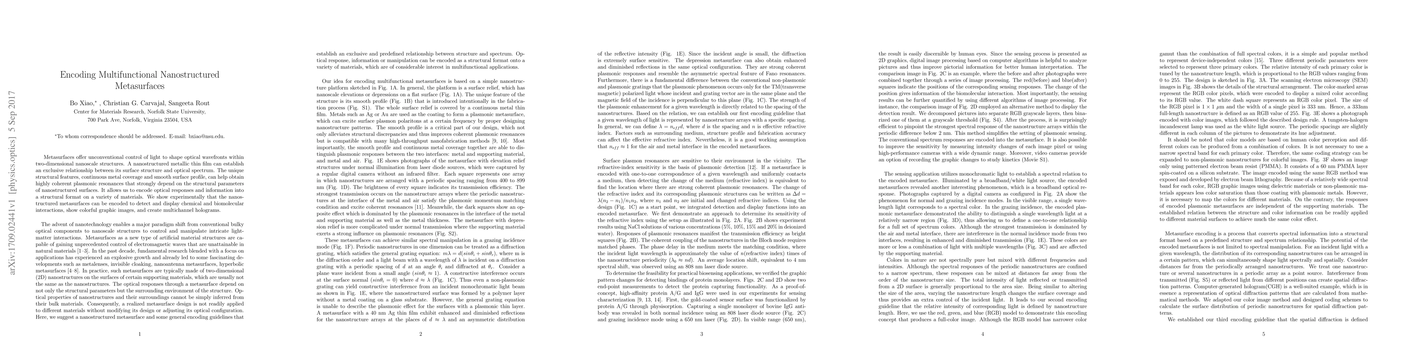 Metasurfaces offer unconventional control of light to shape optical wavefronts within two-dimensional nanoscale structures. A nanostructured metallic thin film can establish an exclusive relationship between its surface structure and optical spectrum. The unique structural features, continuous metal coverage and smooth surface profile, can help obtain highly coherent plasmonic resonances that strongly depend on the structural parameters of nanostructured surfaces. It allows us to encode optical responses and information into a structural format on a variety of materials. We show experimentally that the nanostructured metasurfaces can be encoded to detect and display chemical and biomolecular interactions, show colorful graphic images, and create multichannel holograms.