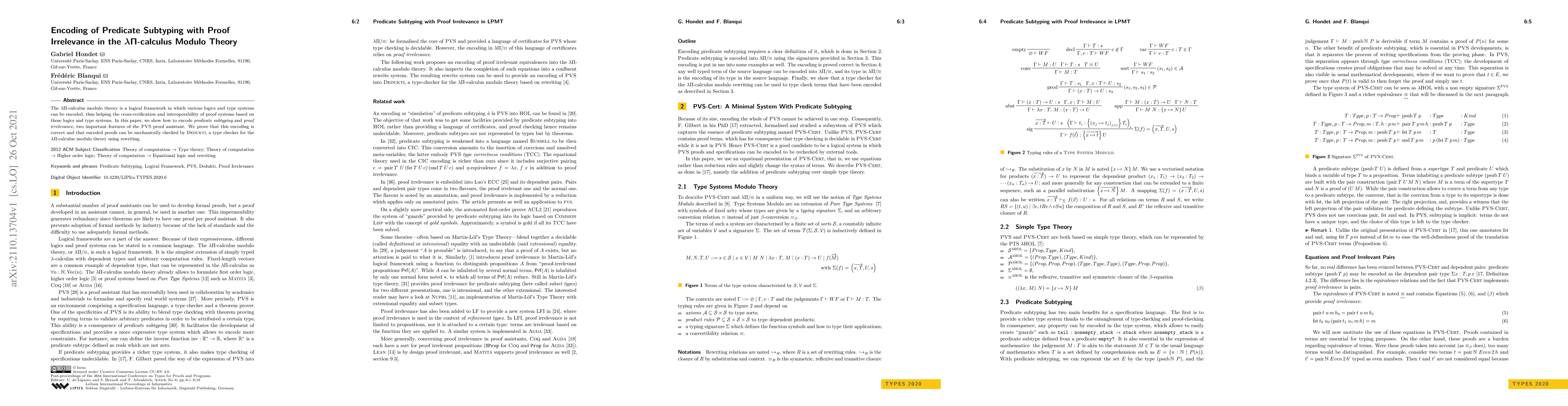 This paper presents an encoding of predicate subtyping and proof irrelevance into the $\lambda$$\Pi$-calculus modulo theory, enabling cross-verification and interoperability of proof systems. The authors demonstrate the correctness of the encoding and show that it can be mechanically checked using Dedukti.