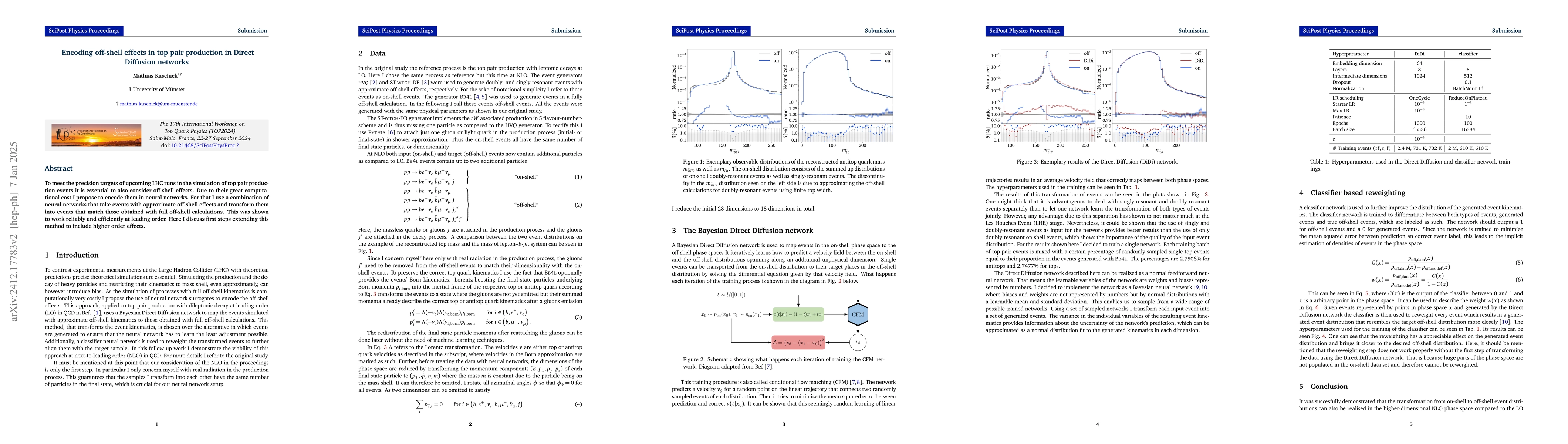 The paper proposes using Direct Diffusion networks to simulate off-shell effects in top pair production, encoding these computationally expensive effects through neural networks. Initial successful results at leading order inspire an extension to higher order effects to meet precision targets for future LHC runs.