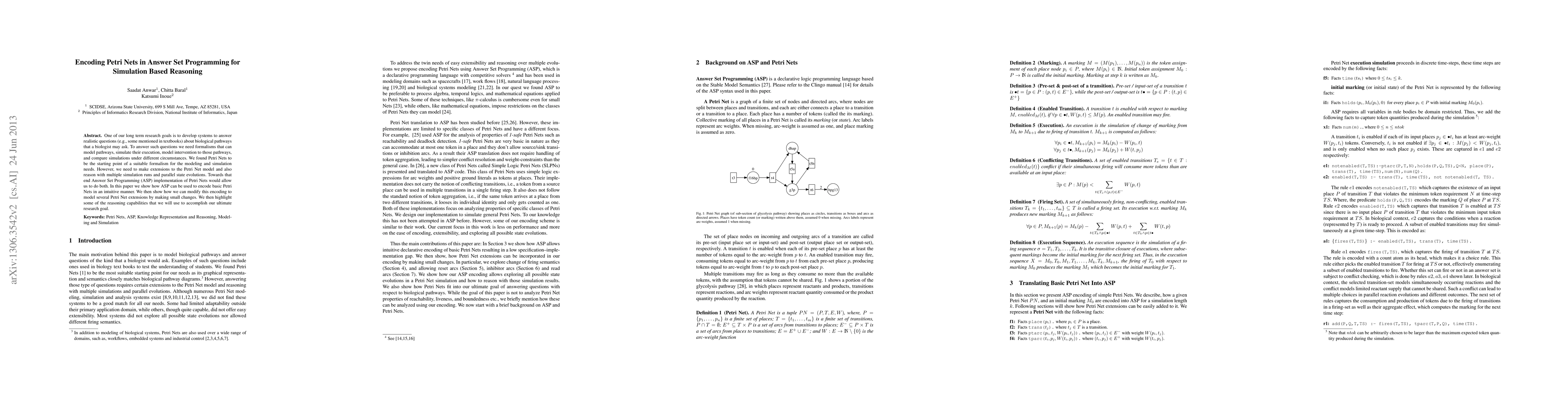 This paper presents an approach to encode Petri Nets in Answer Set Programming (ASP) for simulating biological pathways. It demonstrates how ASP can intuitively model basic Petri Nets and extend them to accommodate various modifications, highlighting the potential for complex simulation and reasoning to answer realistic biological questions.