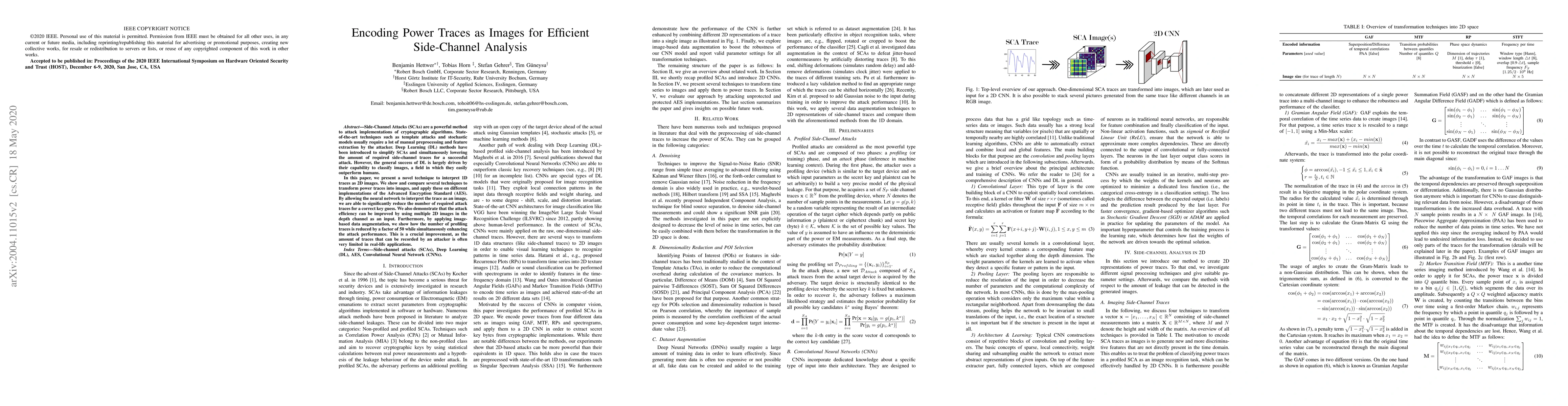 This paper proposes a novel method to encode 1D power traces as 2D images for side-channel analysis, significantly reducing the number of required traces for successful attacks on AES implementations. By using deep learning and image-based data augmentation, the authors demonstrate a 50-fold reduction in profiling traces while improving attack efficiency.