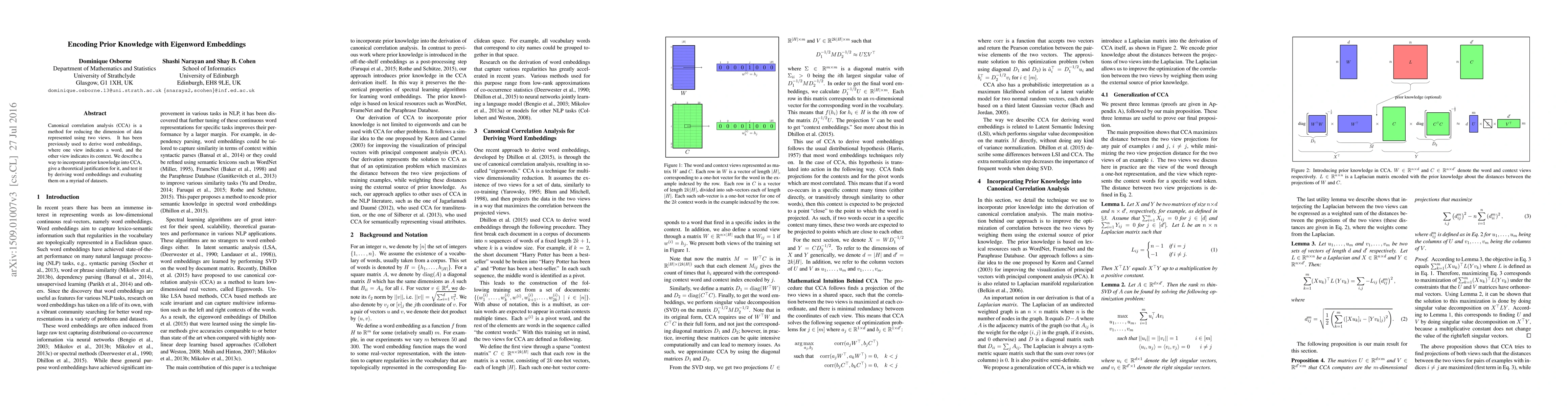 This paper proposes a method to incorporate prior knowledge into canonical correlation analysis (CCA) for deriving word embeddings, theoretically justifies the approach, and evaluates the effectiveness of the resulting eigenword embeddings across various datasets.