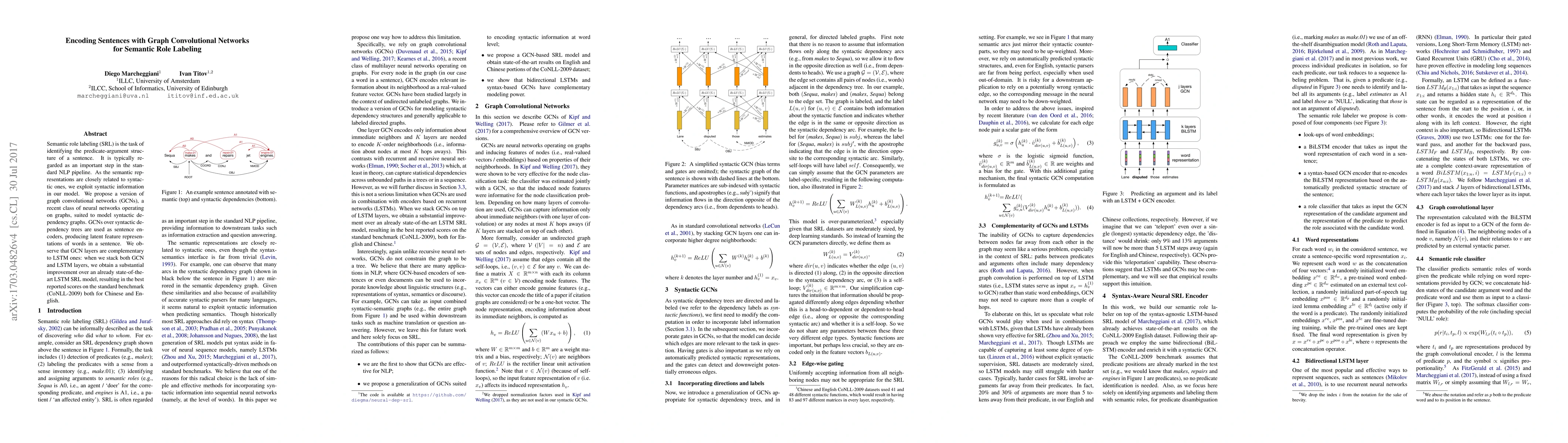 This paper proposes using graph convolutional networks (GCNs) to encode sentences by modeling syntactic dependency graphs for semantic role labeling (SRL). Combining GCN layers with LSTM layers yields substantial improvements over state-of-the-art LSTM models, achieving the best results on the CoNLL-2009 benchmark for both Chinese and English.