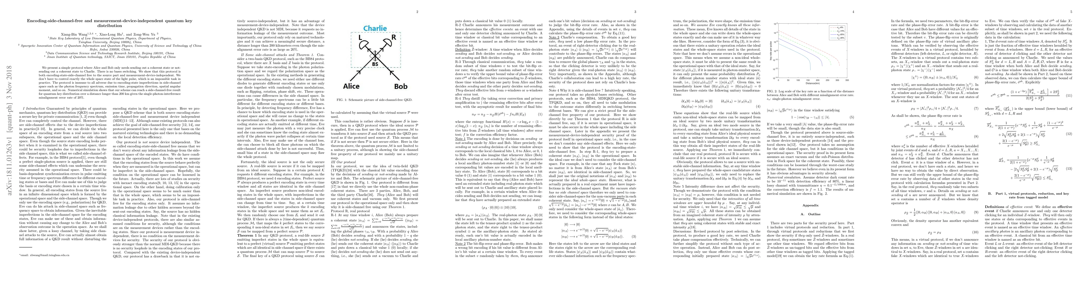 We present a simple protocol where Alice and Bob only needs sending out a coherent state or not-sending out a coherent state to Charlie. There is no bases switching. We show that this protocol is both encoding-state-side-channel free to the source part and measurement-device-independent. We don't have to control exactly the whole space state of the light pulse, which is an impossible task in practice. The protocol is immune to all adverse due to encoding-state imperfections in side-channel space such as the photon frequency spectrum, emission time, propagation direction, spatial angular moment, and so on. Numerical simulation shows that our scheme can reach a side-channel-free result for quantum key distribution over a distance longer than 200 km given the single-photon-interference misalignment error rate of $20\%$.