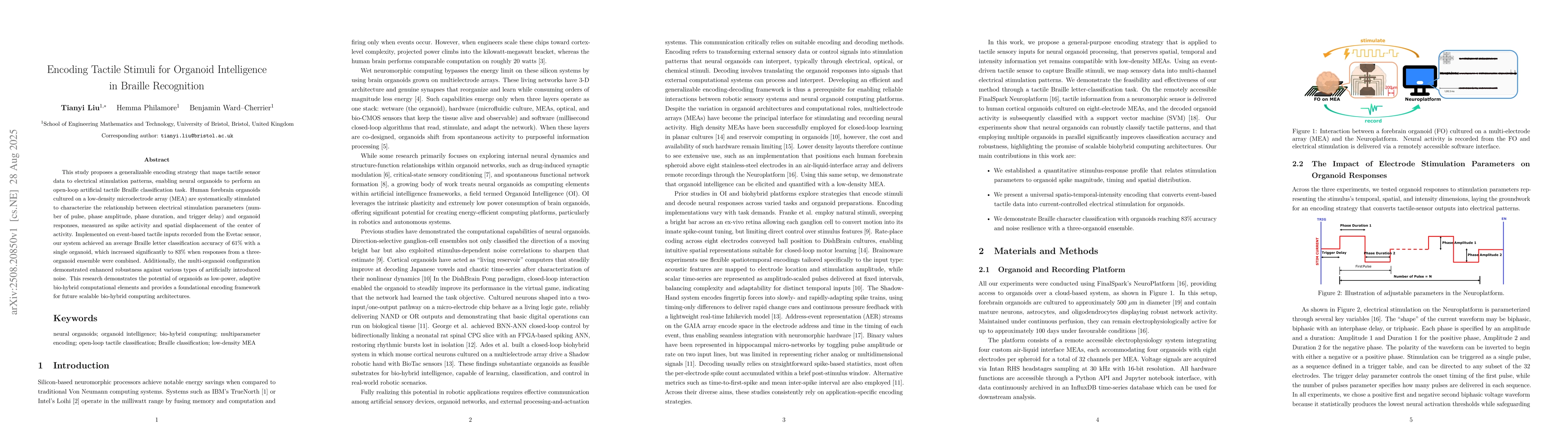 This study proposes a generalizable encoding strategy that maps tactile sensor data to electrical stimulation patterns, enabling neural organoids to perform an open-loop artificial tactile Braille classification task. Human forebrain organoids cultured on a low-density microelectrode array (MEA) are systematically stimulated to characterize the relationship between electrical stimulation parameters (number of pulse, phase amplitude, phase duration, and trigger delay) and organoid responses, measured as spike activity and spatial displacement of the center of activity. Implemented on event-based tactile inputs recorded from the Evetac sensor, our system achieved an average Braille letter classification accuracy of 61 percent with a single organoid, which increased significantly to 83 percent when responses from a three-organoid ensemble were combined. Additionally, the multi-organoid configuration demonstrated enhanced robustness against various types of artificially introduced noise. This research demonstrates the potential of organoids as low-power, adaptive bio-hybrid computational elements and provides a foundational encoding framework for future scalable bio-hybrid computing architectures.