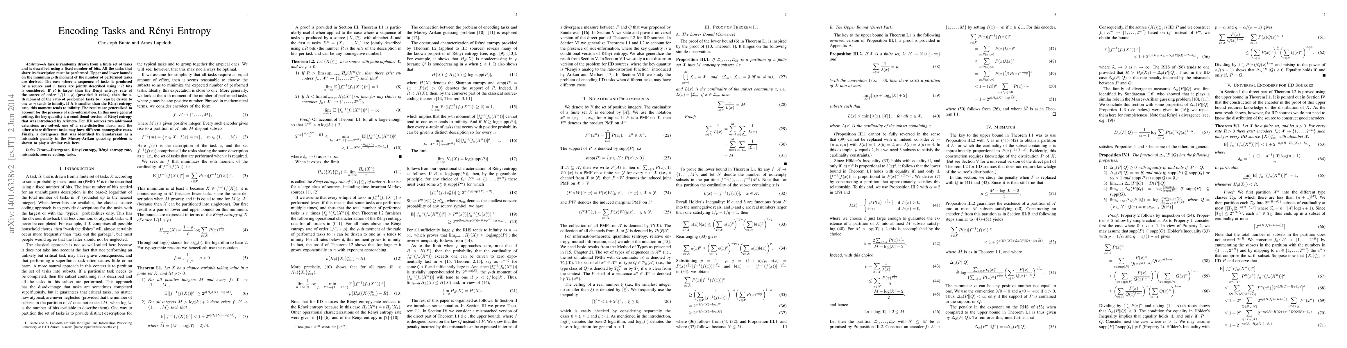 This paper investigates the relationship between encoding tasks and Rényi entropy, deriving bounds on the minimum ρ-th moment of performed tasks. It shows that when the description bits exceed the Rényi entropy rate, the ratio of performed tasks approaches one as the number of tasks increases.