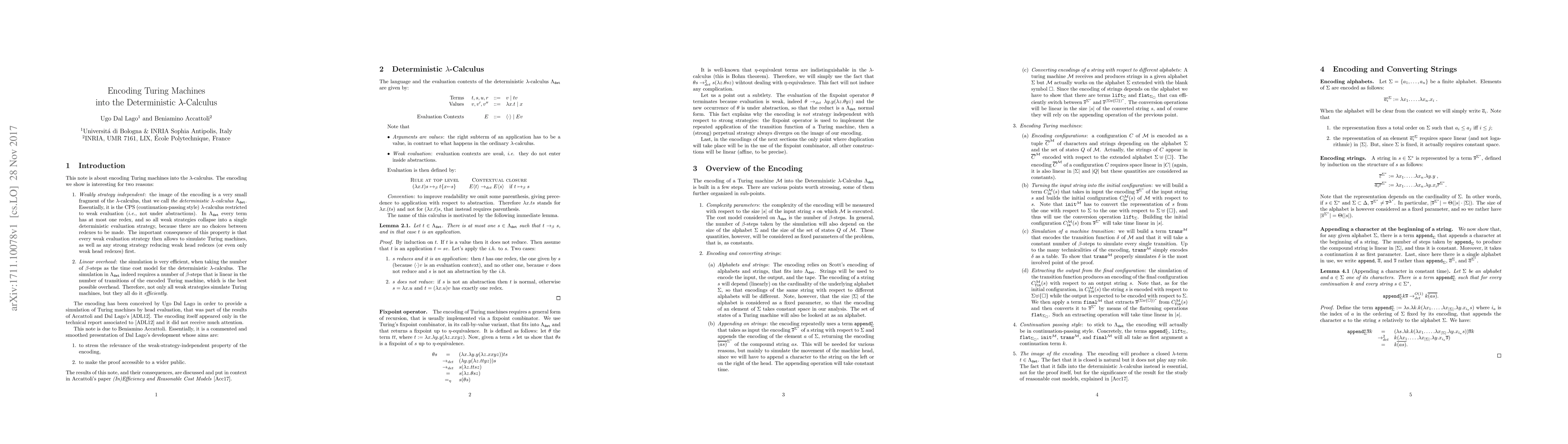 Summary: This paper explores the encoding of Turing machines within the framework of the deterministic lambda-calculus, providing a method to represent computational processes defined by Turing machines using lambda-calculus expressions. The focus is on demonstrating the equivalence and potential for computation within this encoding.
