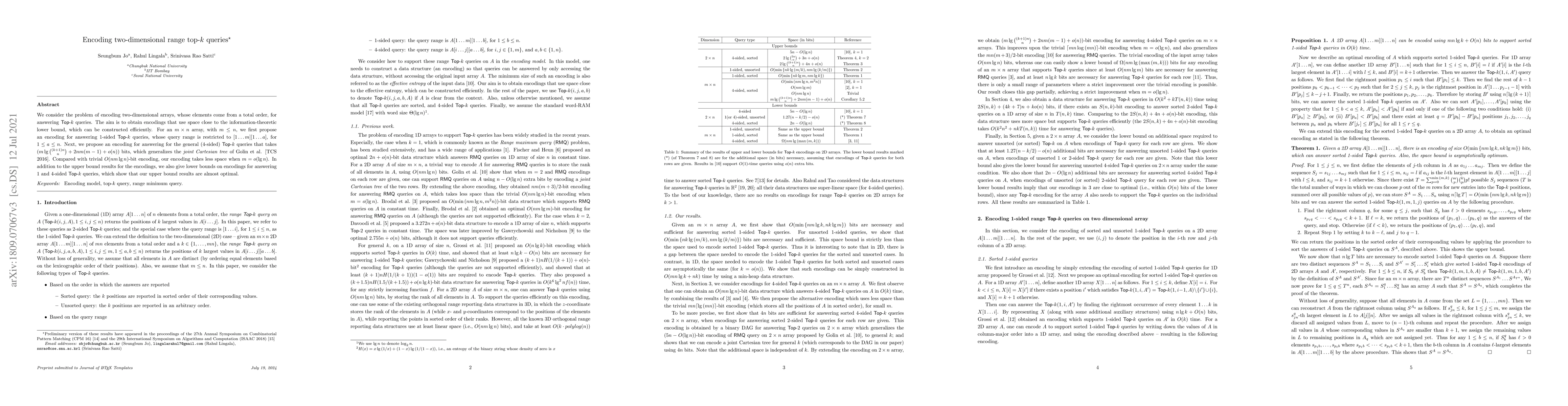 This paper proposes encodings for two-dimensional arrays to efficiently answer top-k queries, achieving space close to the information-theoretic lower bound. The authors introduce encodings for both 1-sided and general 4-sided top-k queries, demonstrating significant space savings compared to trivial methods when the array's height is much smaller than its logarithm.