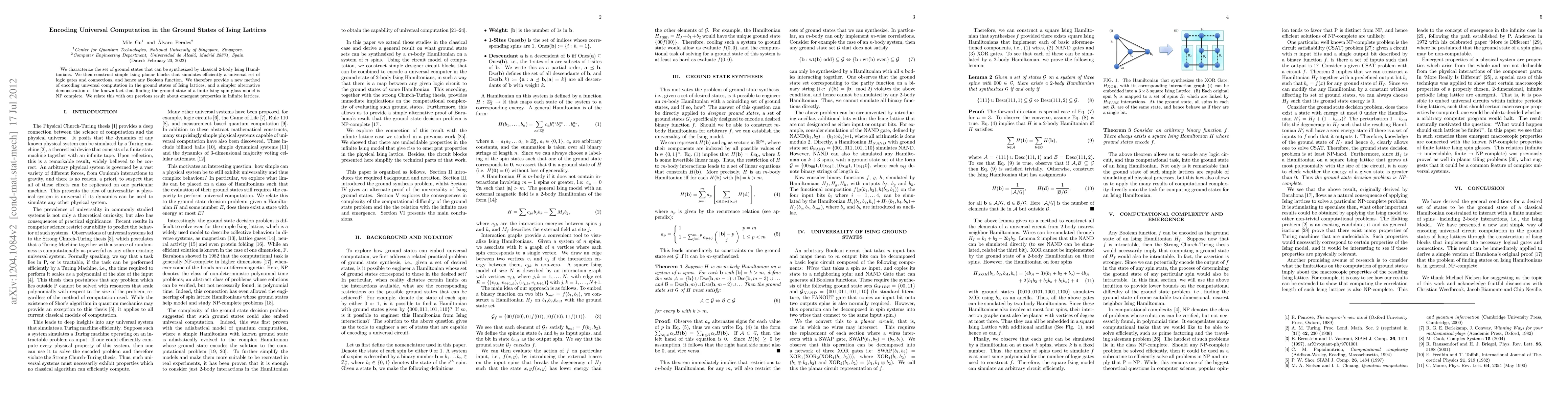 We characterize the set of ground states that can be synthesized by classical 2-body Ising Hamiltonians. We then construct simple Ising planar blocks that simulates efficiently a universal set of logic gates and connections, and hence any boolean function. We therefore provide a new method of encoding universal computation in the ground states of Ising lattices, and a simpler alternative demonstration of the known fact that finding the ground state of a finite Ising spin glass model is NP complete. We relate this with our previous result about emergence properties in infinite lattices.