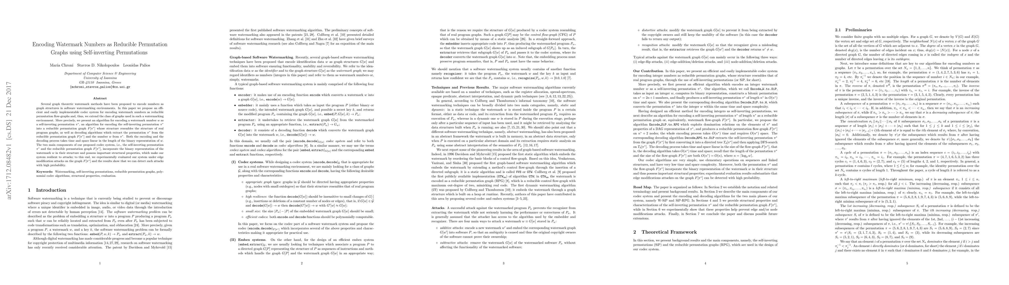 This paper proposes a codec system for encoding watermark numbers as reducible permutation flow-graphs using self-inverting permutations. The system efficiently encodes numbers into permutation graphs and decodes them back, demonstrating resilience against edge modification attacks.