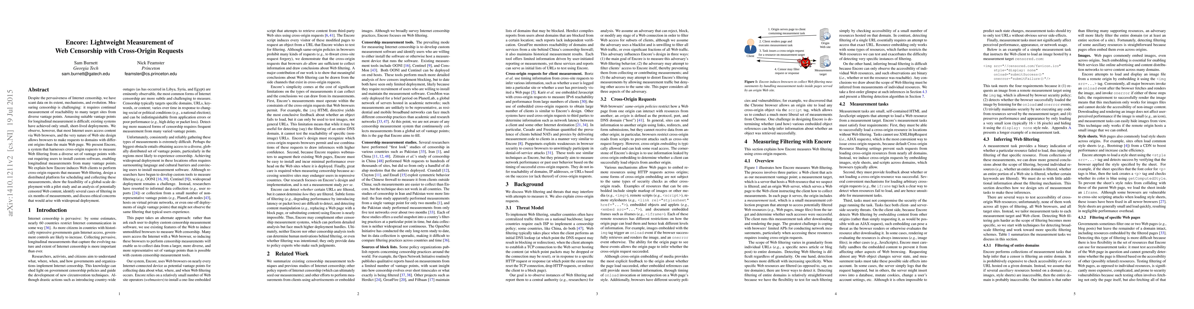 Encore leverages cross-origin requests from web browsers to measure web censorship without requiring user software installation, enabling extensive longitudinal data collection. The system identifies instances of web filtering through a pilot study and discusses ethical implications for broader deployment.