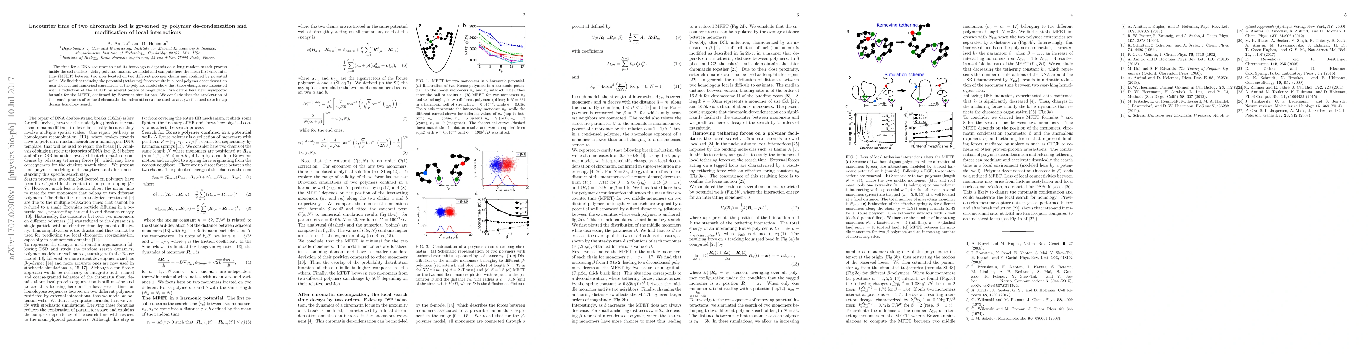 The time for a DNA sequence to find its homologous depends on a long random search process inside the cell nucleus. Using polymer models, we model and compute here the mean first encounter time (MFET) between two sites located on two different polymer chains and confined by potential wells. We find that reducing the potential (tethering) forces results in a local polymer decondensation near the loci and numerical simulations of the polymer model show that these changes are associated with a reduction of the MFET by several orders of magnitude. We derive here new asymptotic formula for the MFET, confirmed by Brownian simulations. We conclude that the acceleration of the search process after local chromatin decondensation can be used to analyze the local search step during homology search.