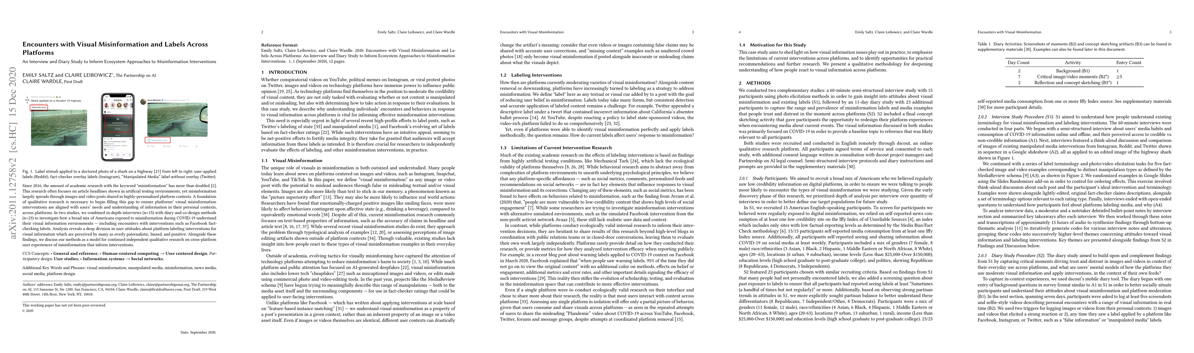 This study combines interviews and diary methods to explore how Americans encounter visual misinformation across platforms, revealing significant user skepticism towards platform labeling interventions perceived as biased and paternalistic. The research advocates for qualitative methods to inform more effective cross-platform misinformation interventions.