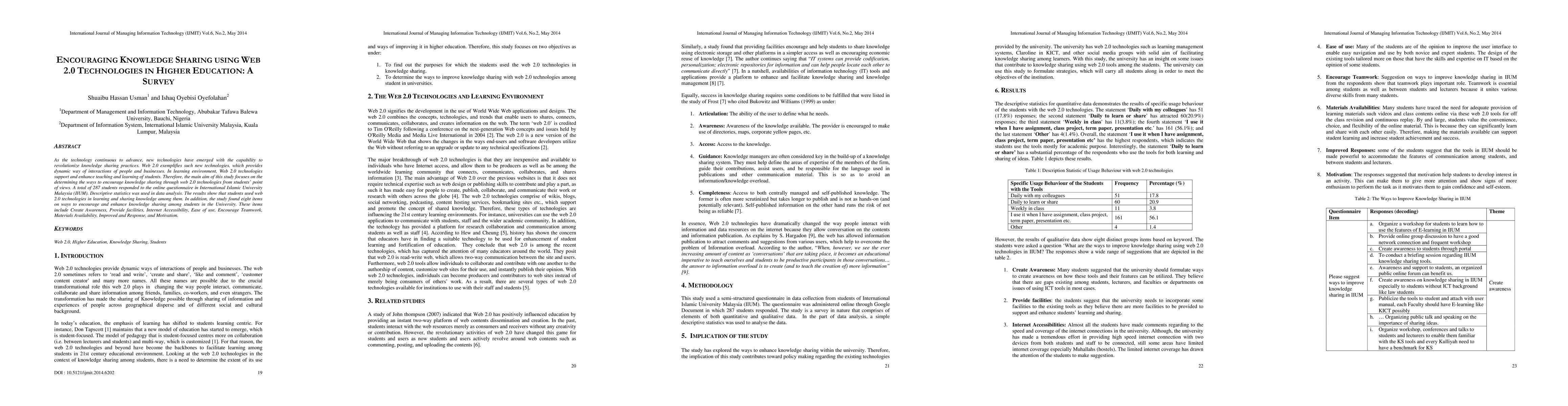 This study surveys students' perspectives on using Web 2.0 technologies to enhance knowledge sharing in higher education. Findings from 287 respondents indicate that these technologies are already utilized in learning, and eight key factors identified to further encourage sharing include awareness creation, internet accessibility, and ease of use.