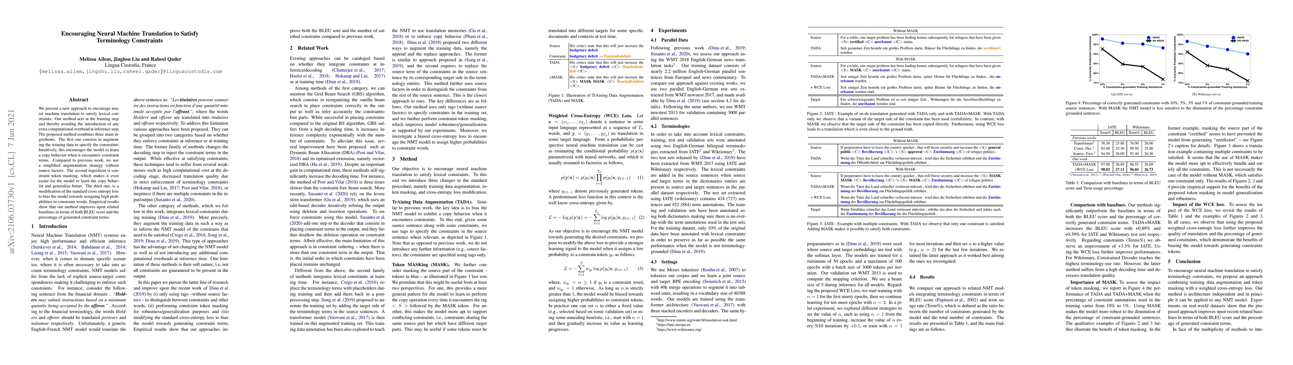 This paper proposes a method to enhance neural machine translation to adhere to lexical constraints by augmenting training data, employing constraint token masking, and modifying the cross-entropy loss. This approach improves both BLEU scores and the accuracy of constraint term generation without adding computational overhead during inference.