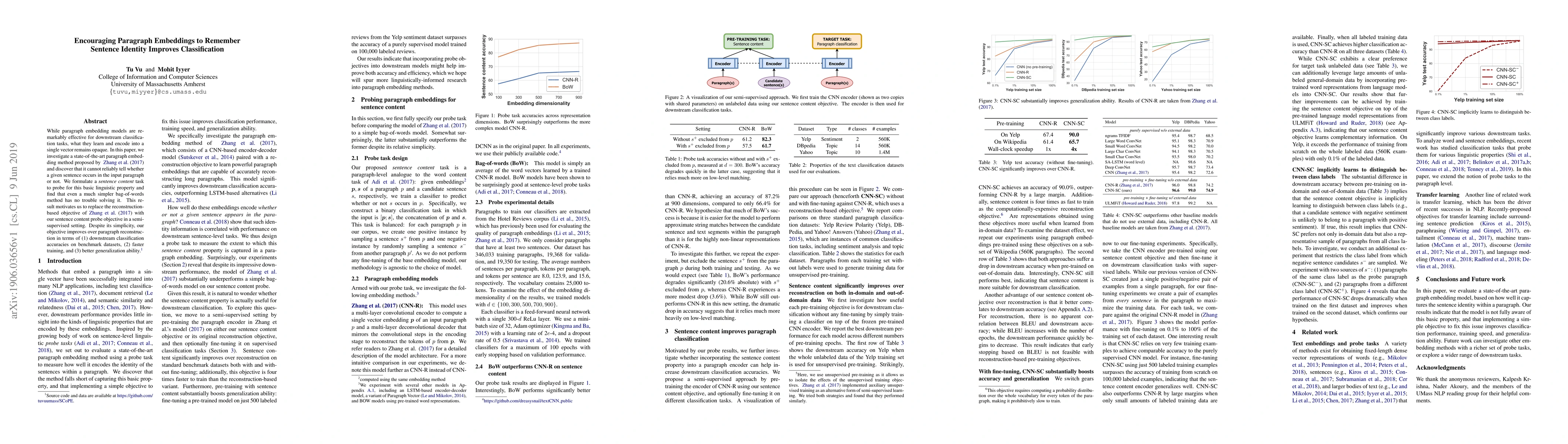 This paper investigates the limitations of a state-of-the-art paragraph embedding method, finding it struggles to identify individual sentences within a paragraph. By introducing a sentence content probe objective, the authors achieve improved classification accuracy, faster training, and better generalization compared to the original method.