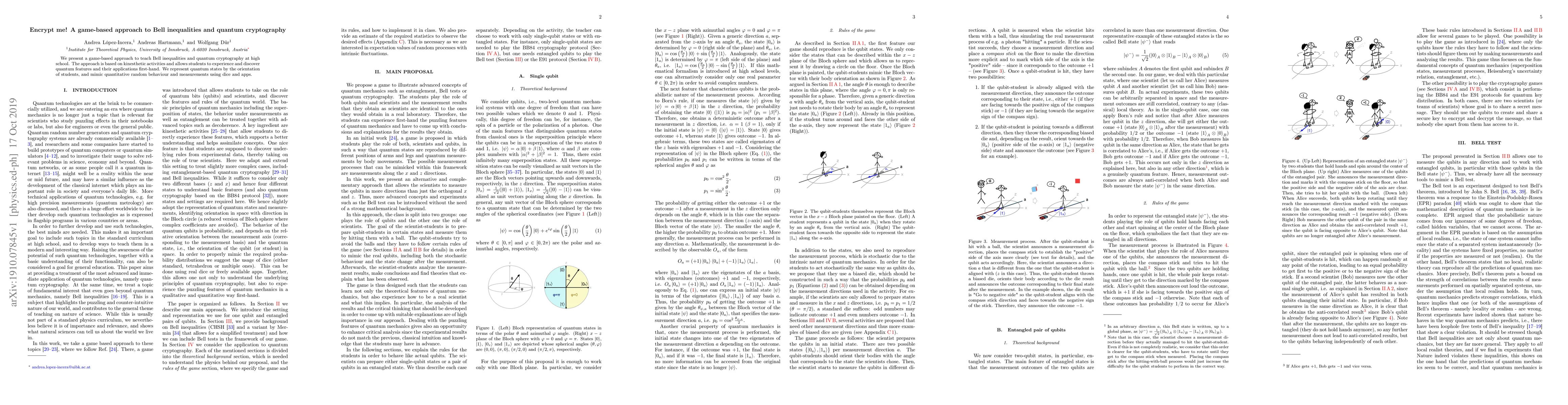 Summary: This paper introduces a game-based method to teach high school students about Bell inequalities and quantum cryptography through kinesthetic activities, allowing students to experience quantum concepts and measurements firsthand using physical orientation, dice, and apps.