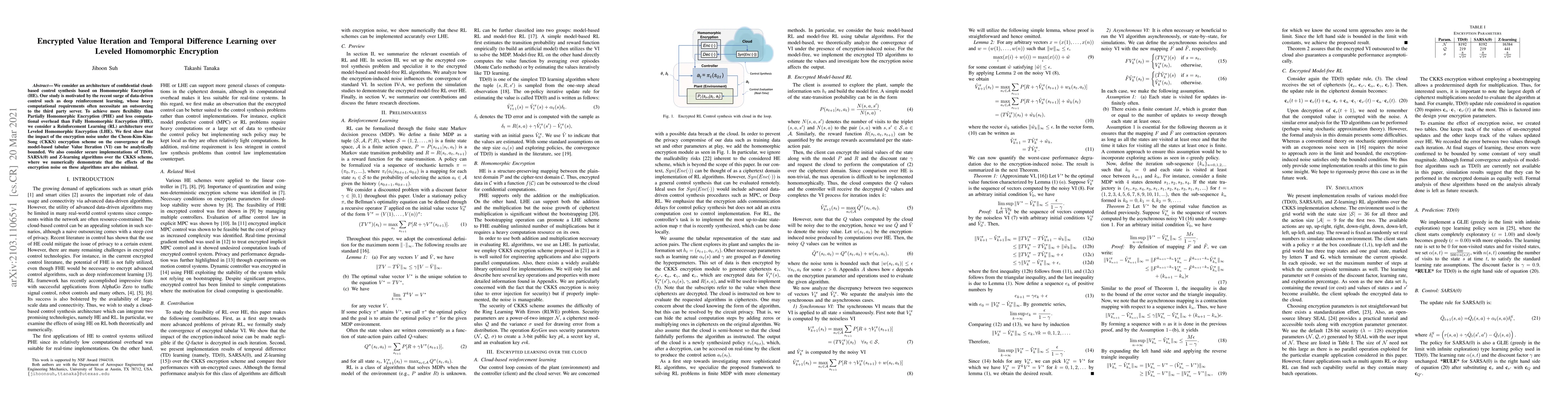 We consider an architecture of confidential cloud-based control synthesis based on Homomorphic Encryption (HE). Our study is motivated by the recent surge of data-driven control such as deep reinforcement learning, whose heavy computational requirements often necessitate an outsourcing to the third party server. To achieve more flexibility than Partially Homomorphic Encryption (PHE) and less computational overhead than Fully Homomorphic Encryption (FHE), we consider a Reinforcement Learning (RL) architecture over Leveled Homomorphic Encryption (LHE). We first show that the impact of the encryption noise under the Cheon-Kim-Kim-Song (CKKS) encryption scheme on the convergence of the model-based tabular Value Iteration (VI) can be analytically bounded. We also consider secure implementations of TD(0), SARSA(0) and Z-learning algorithms over the CKKS scheme, where we numerically demonstrate that the effects of the encryption noise on these algorithms are also minimal.