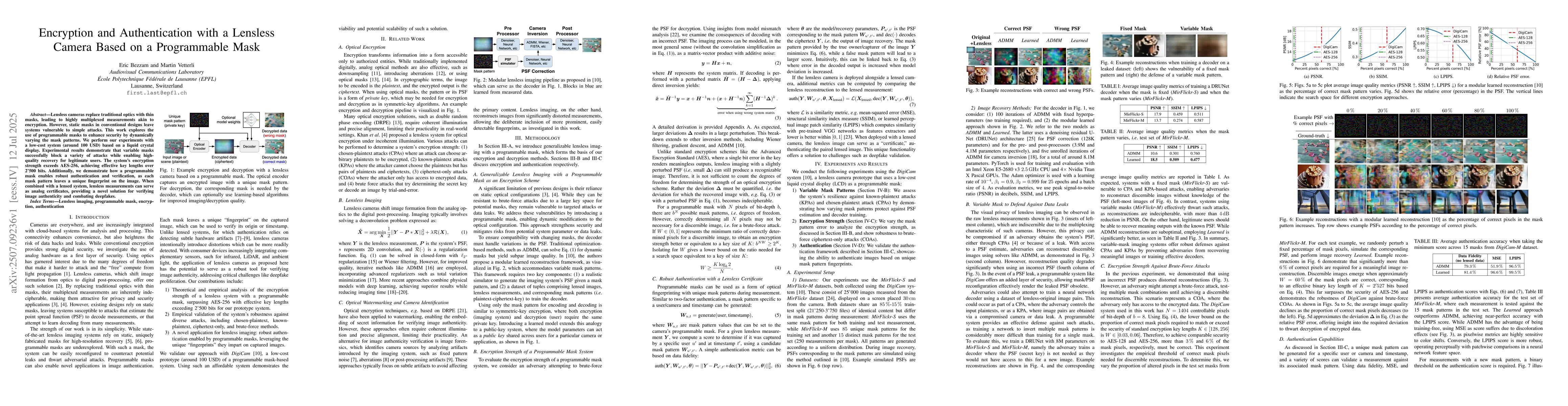 The paper presents a lensless camera system with a programmable mask that dynamically varies patterns for enhanced security and authentication, surpassing AES-256 in encryption strength.