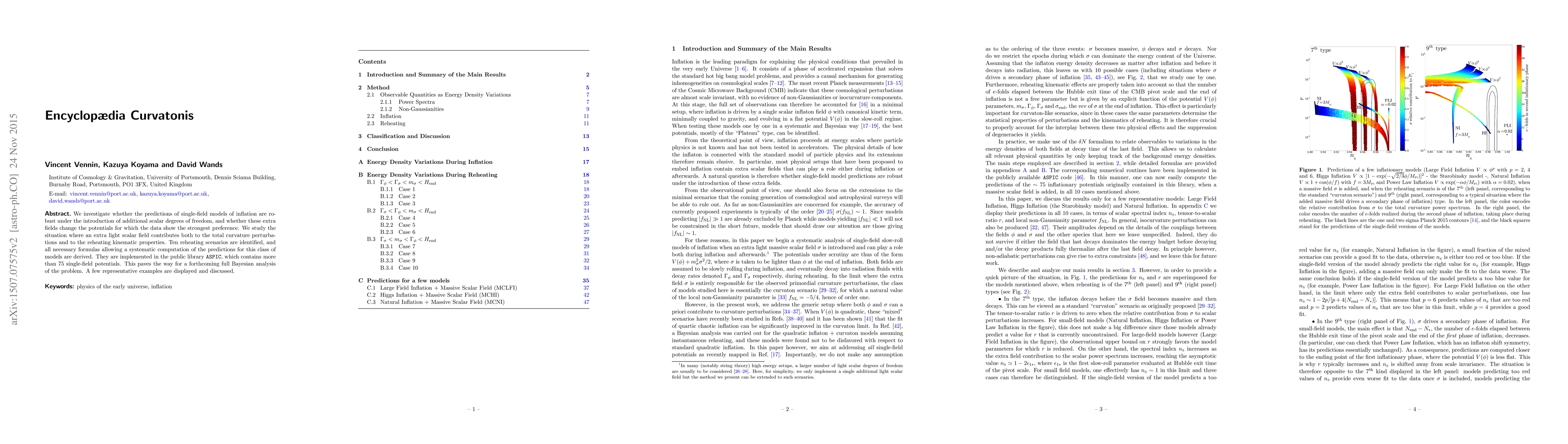 We investigate whether the predictions of single-field models of inflation are robust under the introduction of additional scalar degrees of freedom, and whether these extra fields change the potentials for which the data show the strongest preference. We study the situation where an extra light scalar field contributes both to the total curvature perturbations and to the reheating kinematic properties. Ten reheating scenarios are identified, and all necessary formulas allowing a systematic computation of the predictions for this class of models are derived. They are implemented in the public library ASPIC, which contains more than 75 single-field potentials. This paves the way for a forthcoming full Bayesian analysis of the problem. A few representative examples are displayed and discussed.