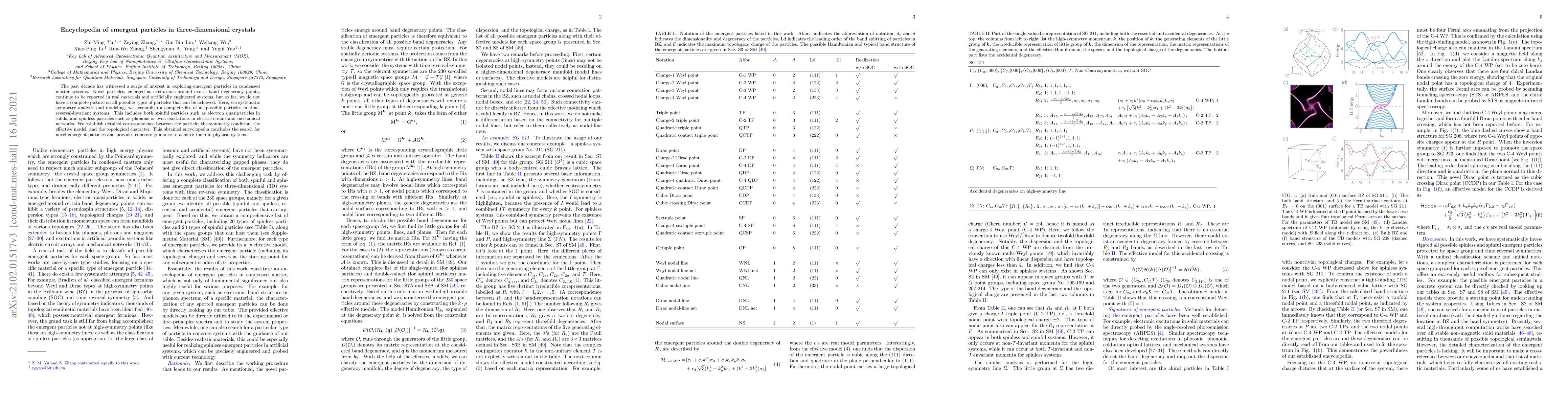 This paper systematically catalogs all possible emergent particles in three-dimensional crystals, identifying both spinful and spinless types through symmetry analysis and modeling. It establishes a comprehensive correspondence between particle types, symmetry conditions, effective models, and topological characteristics, thereby completing the search for novel emergent particles and offering practical guidance for their realization in physical systems.