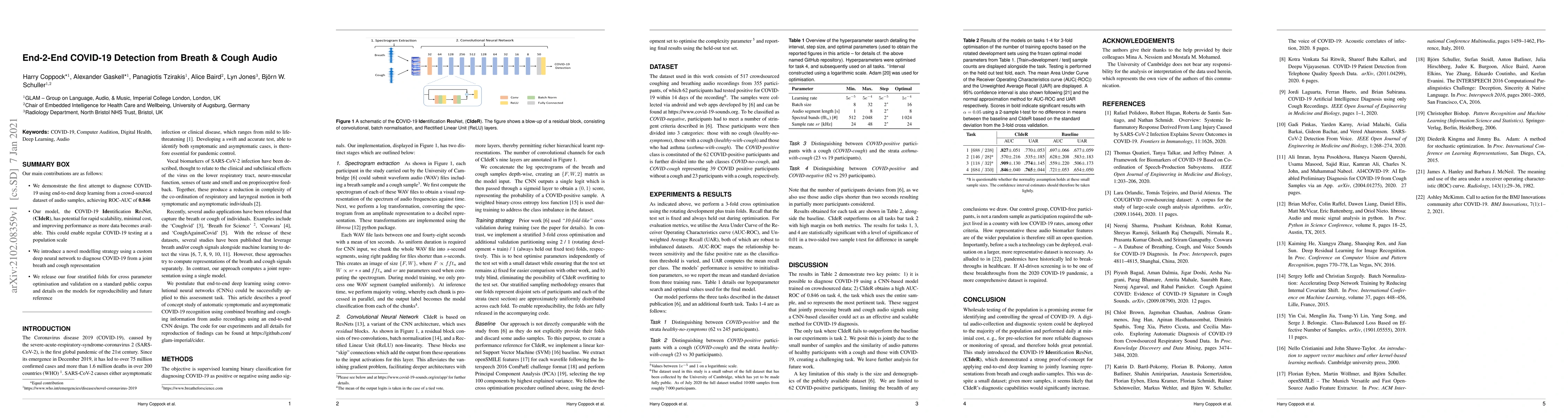 Our main contributions are as follows: (I) We demonstrate the first attempt to diagnose COVID-19 using end-to-end deep learning from a crowd-sourced dataset of audio samples, achieving ROC-AUC of 0.846; (II) Our model, the COVID-19 Identification ResNet, (CIdeR), has potential for rapid scalability, minimal cost and improving performance as more data becomes available. This could enable regular COVID-19 testing at apopulation scale; (III) We introduce a novel modelling strategy using a custom deep neural network to diagnose COVID-19 from a joint breath and cough representation; (IV) We release our four stratified folds for cross parameter optimisation and validation on a standard public corpus and details on the models for reproducibility and future reference.