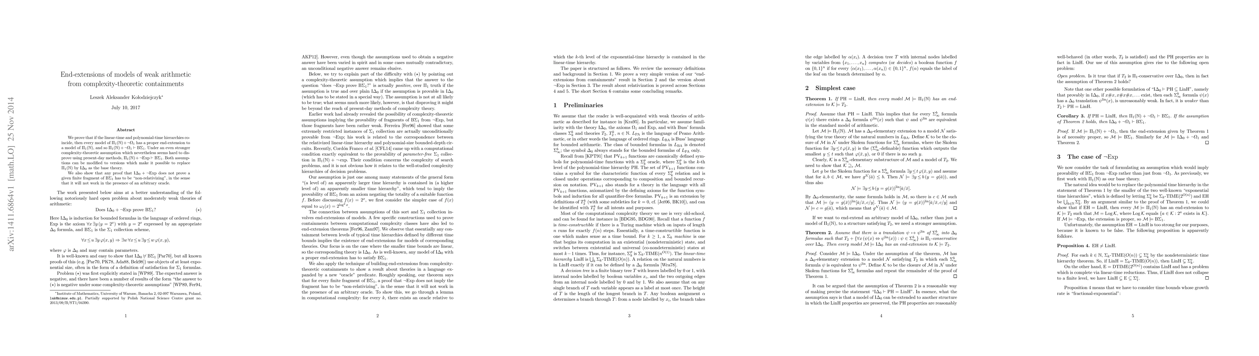 We prove that if the linear-time and polynomial-time hierarchies coincide, then every model of $\Pi_1(\mathbb{N}) + \neg \Omega_1$ has a proper end-extension to a model of $\Pi_1(\mathbb{N})$, and so $\Pi_1(\mathbb{N}) + \neg \Omega_1 \vdash \mathrm{B}\Sigma_1$. Under an even stronger complexity-theoretic assumption which nevertheless seems hard to disprove using present-day methods, $\Pi_1(\mathbb{N}) + \neg \mathrm{Exp} \vdash \mathrm{B}\Sigma_1$. Both assumptions can be modified to versions which make it possible to replace $\Pi_1(\mathbb{N})$ by $\mathrm{I}\Delta_0$ as the base theory. We also show that any proof that $\mathrm{I}\Delta_0 + \neg \exp$ does not prove a given finite fragment of $\mathrm{B}\Sigma_1$ has to be "non-relativizing", in the sense that it will not work in the presence of an arbitrary oracle.