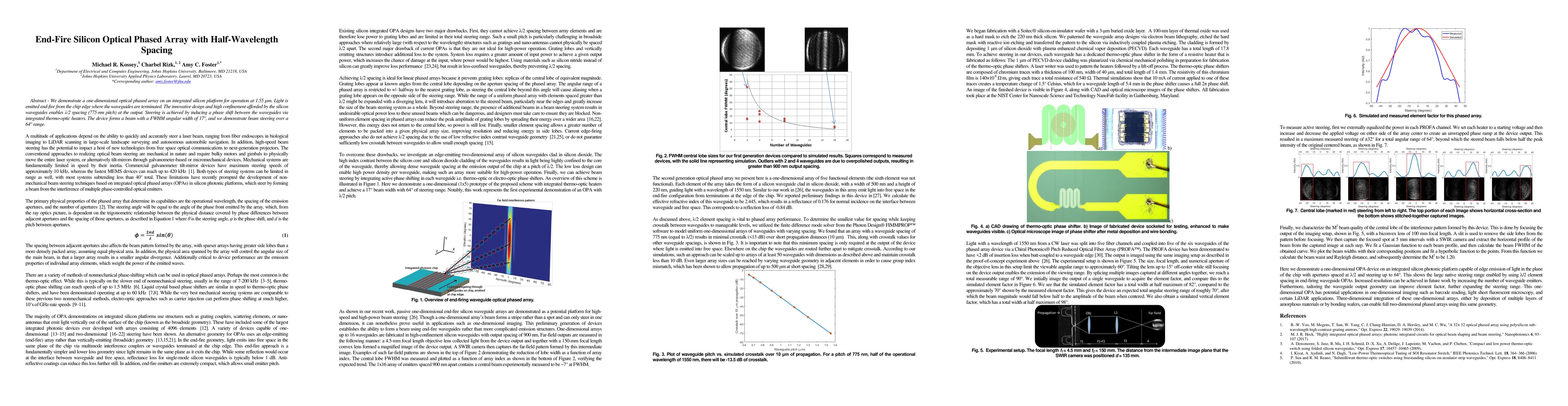 This paper presents a one-dimensional end-fire silicon optical phased array with half-wavelength waveguide spacing, enabling beam steering via thermo-optic phase shifts and demonstrating a 64-degree steering range with a 17-degree beam width.
