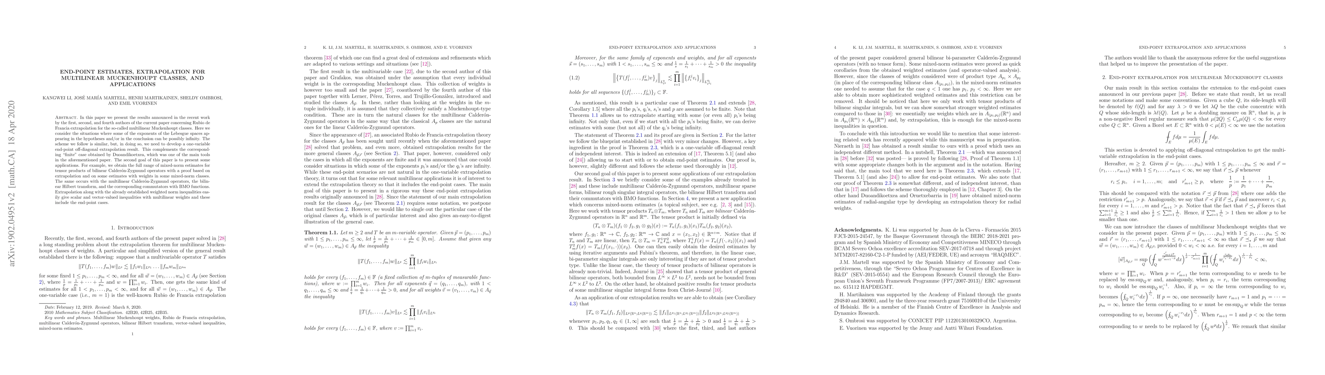 In this paper we present the results announced in the recent work by the first, second, and fourth authors of the current paper concerning Rubio de Francia extrapolation for the so-called multilinear Muckenhoupt classes. Here we consider the situations where some of the exponents of the Lebesgue spaces appearing in the hypotheses and/or in the conclusion can be possibly infinity. The scheme we follow is similar, but, in doing so, we need to develop a one-variable end-point off-diagonal extrapolation result. This complements the corresponding ``finite'' case obtained by Duoandikoetxea, which was one of the main tools in the aforementioned paper. The second goal of this paper is to present some applications. For example, we obtain the full range of mixed-norm estimates for tensor products of bilinear Calder\'on-Zygmund operators with a proof based on extrapolation and on some estimates with weights in some mixed-norm classes. The same occurs with the multilinear Calder\'on-Zygmund operators, the bilinear Hilbert transform, and the corresponding commutators with BMO functions. Extrapolation along with the already established weighted norm inequalities easily give scalar and vector-valued inequalities with multilinear weights and these include the end-point cases.