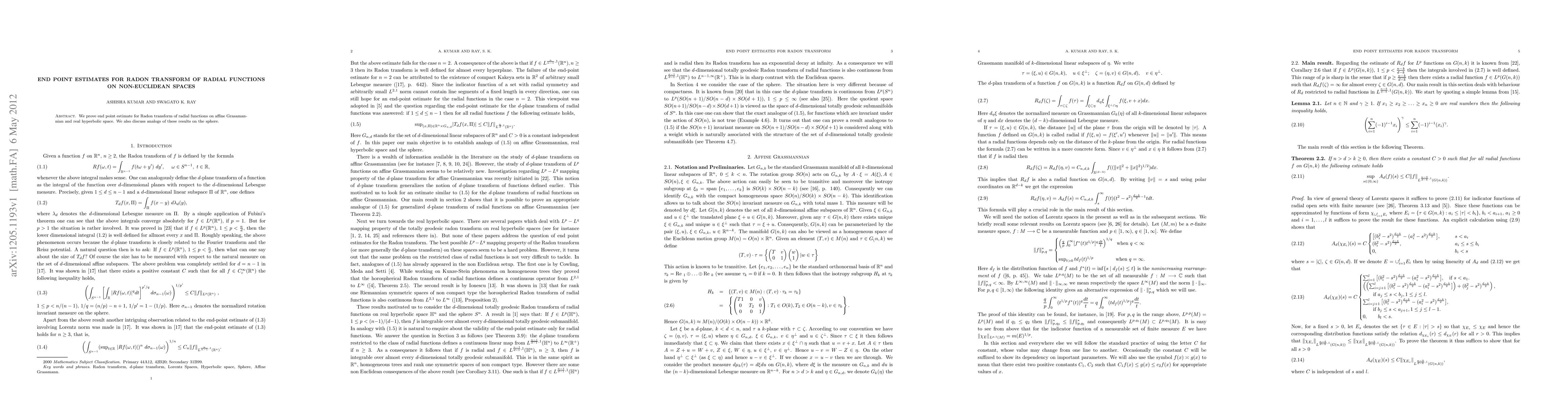 Summary: This paper establishes endpoint estimates for the Radon transform of radial functions on affine Grassmannian and real hyperbolic space, and explores analogous results on the sphere. The findings provide insights into the behavior of these transforms in non-Euclidean geometries.