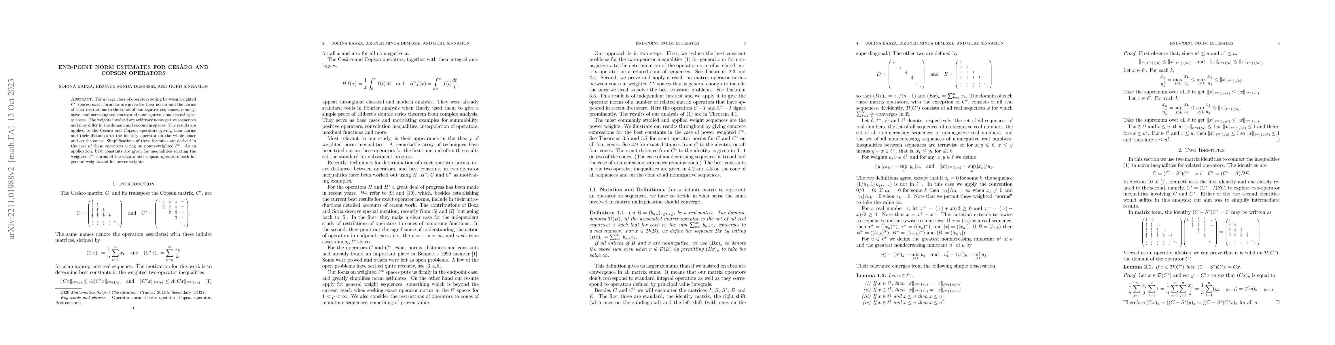 For a large class of operators acting between weighted $\ell^\infty$ spaces, exact formulas are given for their norms and the norms of their restrictions to the cones of nonnegative sequences; nonnegative, nonincreasing sequences; and nonnegative, nondecreasing sequences. The weights involved are arbitrary nonnegative sequences and may differ in the domain and codomain spaces. The results are applied to the Ces\`aro and Copson operators, giving their norms and their distances to the identity operator on the whole space and on the cones. Simplifications of these formulas are derived in the case of these operators acting on power-weighted $\ell^\infty$. As an application, best constants are given for inequalities relating the weighted $\ell^\infty$ norms of the Ces\`aro and Copson operators both for general weights and for power weights.