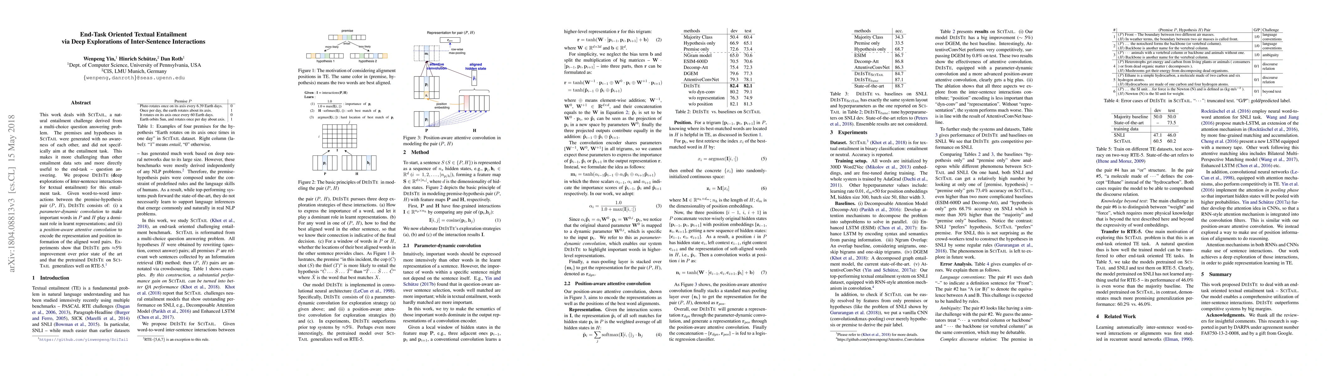 This work deals with SciTail, a natural entailment challenge derived from a multi-choice question answering problem. The premises and hypotheses in SciTail were generated with no awareness of each other, and did not specifically aim at the entailment task. This makes it more challenging than other entailment data sets and more directly useful to the end-task -- question answering. We propose DEISTE (deep explorations of inter-sentence interactions for textual entailment) for this entailment task. Given word-to-word interactions between the premise-hypothesis pair ($P$, $H$), DEISTE consists of: (i) a parameter-dynamic convolution to make important words in $P$ and $H$ play a dominant role in learnt representations; and (ii) a position-aware attentive convolution to encode the representation and position information of the aligned word pairs. Experiments show that DEISTE gets $\approx$5\% improvement over prior state of the art and that the pretrained DEISTE on SciTail generalizes well on RTE-5.