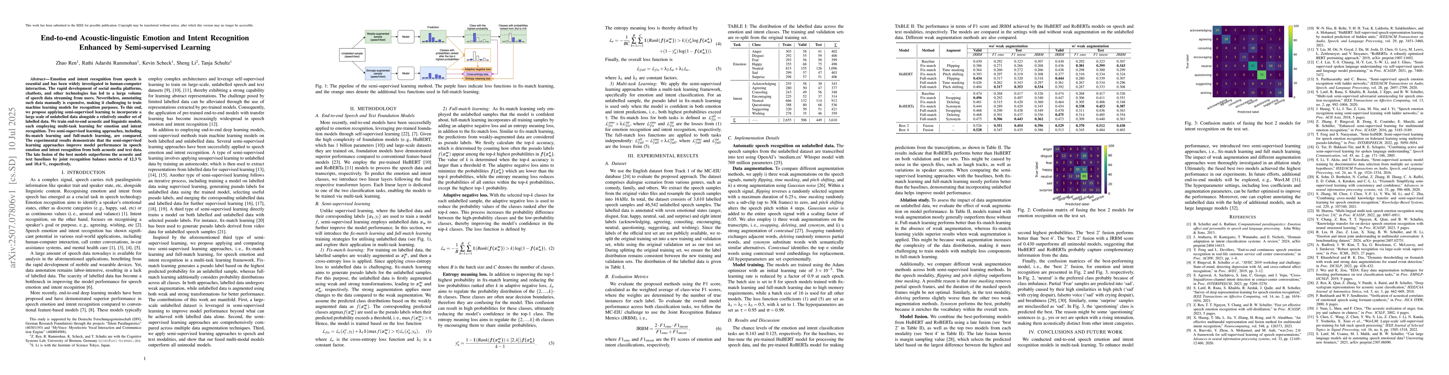 Emotion and intent recognition from speech is essential and has been widely investigated in human-computer interaction. The rapid development of social media platforms, chatbots, and other technologies has led to a large volume of speech data streaming from users. Nevertheless, annotating such data manually is expensive, making it challenging to train machine learning models for recognition purposes. To this end, we propose applying semi-supervised learning to incorporate a large scale of unlabelled data alongside a relatively smaller set of labelled data. We train end-to-end acoustic and linguistic models, each employing multi-task learning for emotion and intent recognition. Two semi-supervised learning approaches, including fix-match learning and full-match learning, are compared. The experimental results demonstrate that the semi-supervised learning approaches improve model performance in speech emotion and intent recognition from both acoustic and text data. The late fusion of the best models outperforms the acoustic and text baselines by joint recognition balance metrics of 12.3% and 10.4%, respectively.