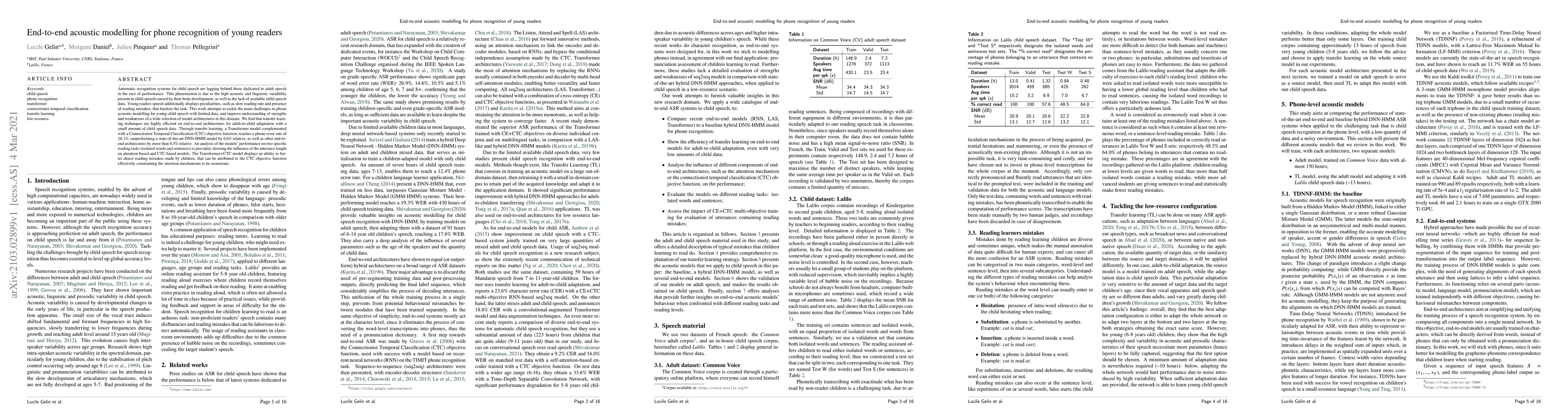 This research improves child speech recognition, specifically for young readers, by applying transfer learning techniques to end-to-end architectures. A Transformer model with a CTC objective function outperforms existing models, reducing phone error rate by 6.6% relative, and better detects reading mistakes due to the CTC's monotonic attention constraint.