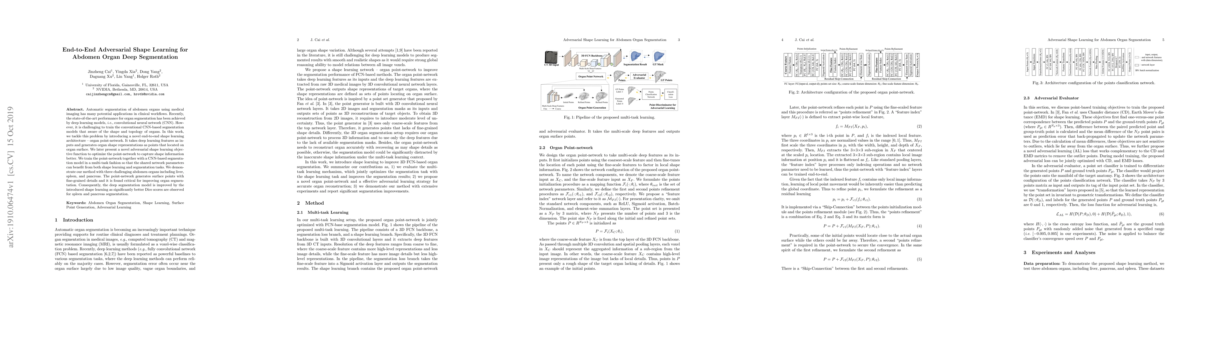 This paper proposes an end-to-end adversarial shape learning architecture called organ point-network to enhance the segmentation of abdomen organs using deep learning. The method integrates shape representations as points on organ surfaces to improve segmentation accuracy, achieving better Dice scores for spleen and pancreas.