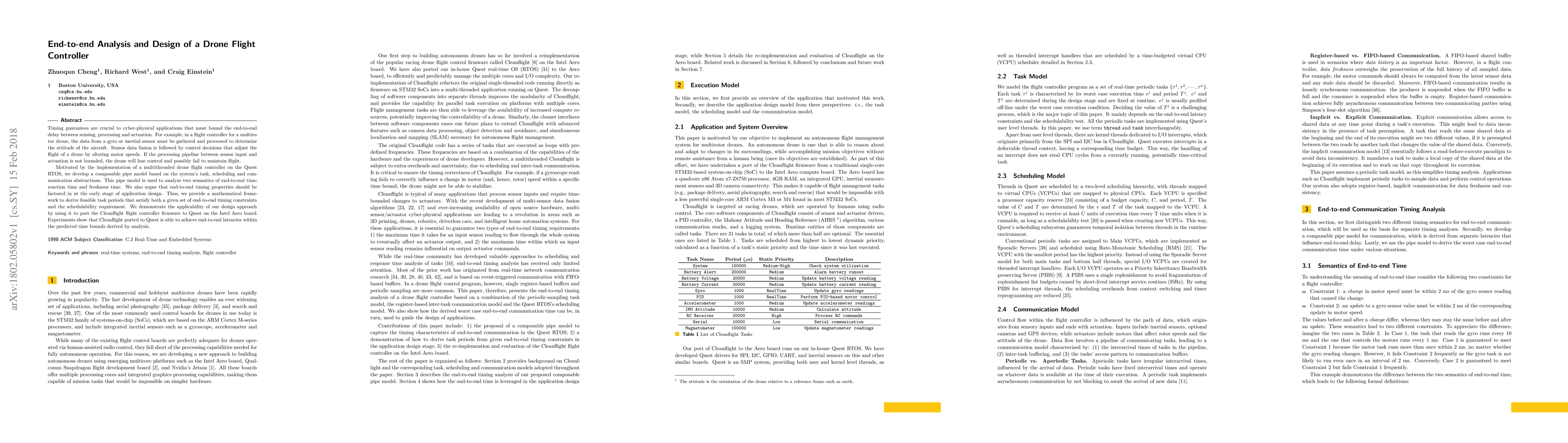 Timing guarantees are crucial to cyber-physical applications that must bound the end-to-end delay between sensing, processing and actuation. For example, in a flight controller for a multirotor drone, the data from a gyro or inertial sensor must be gathered and processed to determine the attitude of the aircraft. Sensor data fusion is followed by control decisions that adjust the flight of a drone by altering motor speeds. If the processing pipeline between sensor input and actuation is not bounded, the drone will lose control and possibly fail to maintain flight. Motivated by the implementation of a multithreaded drone flight controller on the Quest RTOS, we develop a composable pipe model based on the system's task, scheduling and communication abstractions. This pipe model is used to analyze two semantics of end-to-end time: reaction time and freshness time. We also argue that end-to-end timing properties should be factored in at the early stage of application design. Thus, we provide a mathematical framework to derive feasible task periods that satisfy both a given set of end-to-end timing constraints and the schedulability requirement. We demonstrate the applicability of our design approach by using it to port the Cleanflight flight controller firmware to Quest on the Intel Aero board. Experiments show that Cleanflight ported to Quest is able to achieve end-to-end latencies within the predicted time bounds derived by analysis.