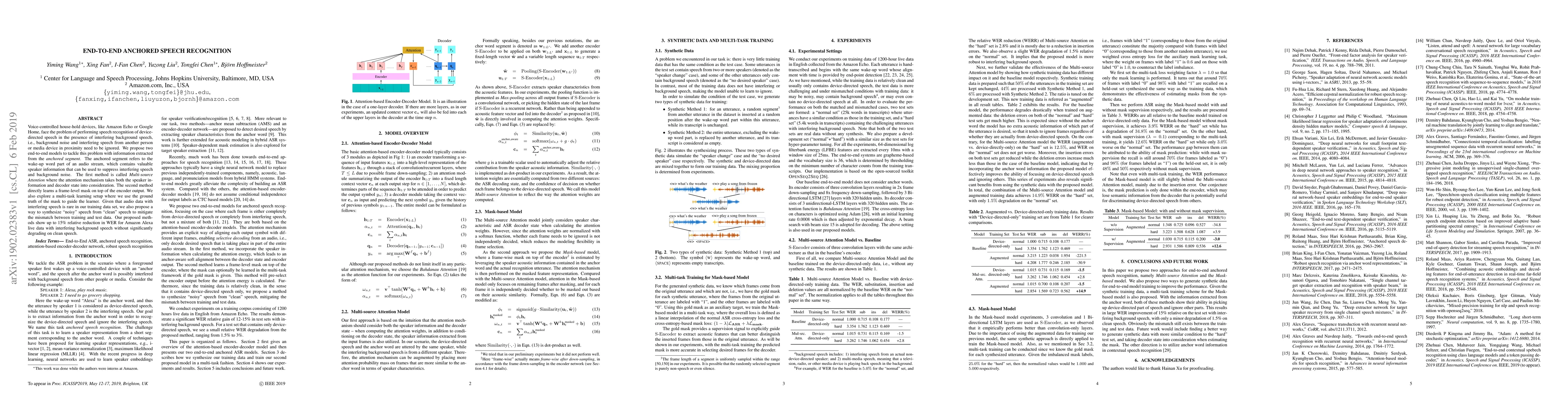Voice-controlled house-hold devices, like Amazon Echo or Google Home, face the problem of performing speech recognition of device-directed speech in the presence of interfering background speech, i.e., background noise and interfering speech from another person or media device in proximity need to be ignored. We propose two end-to-end models to tackle this problem with information extracted from the "anchored segment". The anchored segment refers to the wake-up word part of an audio stream, which contains valuable speaker information that can be used to suppress interfering speech and background noise. The first method is called "Multi-source Attention" where the attention mechanism takes both the speaker information and decoder state into consideration. The second method directly learns a frame-level mask on top of the encoder output. We also explore a multi-task learning setup where we use the ground truth of the mask to guide the learner. Given that audio data with interfering speech is rare in our training data set, we also propose a way to synthesize "noisy" speech from "clean" speech to mitigate the mismatch between training and test data. Our proposed methods show up to 15% relative reduction in WER for Amazon Alexa live data with interfering background speech without significantly degrading on clean speech.