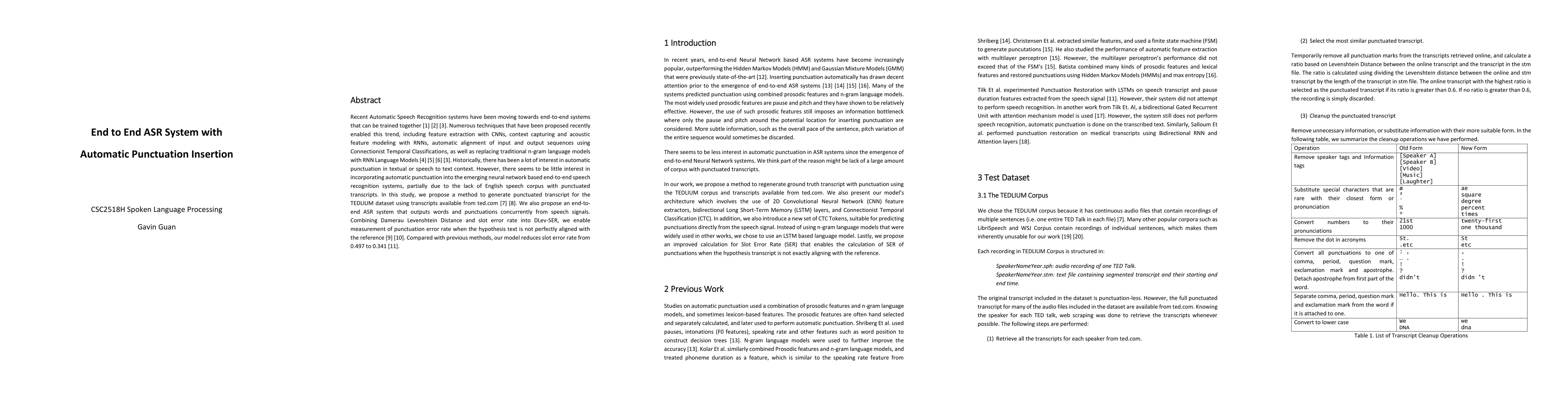 Recent Automatic Speech Recognition systems have been moving towards end-to-end systems that can be trained together. Numerous techniques that have been proposed recently enabled this trend, including feature extraction with CNNs, context capturing and acoustic feature modeling with RNNs, automatic alignment of input and output sequences using Connectionist Temporal Classifications, as well as replacing traditional n-gram language models with RNN Language Models. Historically, there has been a lot of interest in automatic punctuation in textual or speech to text context. However, there seems to be little interest in incorporating automatic punctuation into the emerging neural network based end-to-end speech recognition systems, partially due to the lack of English speech corpus with punctuated transcripts. In this study, we propose a method to generate punctuated transcript for the TEDLIUM dataset using transcripts available from ted.com. We also propose an end-to-end ASR system that outputs words and punctuations concurrently from speech signals. Combining Damerau Levenshtein Distance and slot error rate into DLev-SER, we enable measurement of punctuation error rate when the hypothesis text is not perfectly aligned with the reference. Compared with previous methods, our model reduces slot error rate from 0.497 to 0.341.