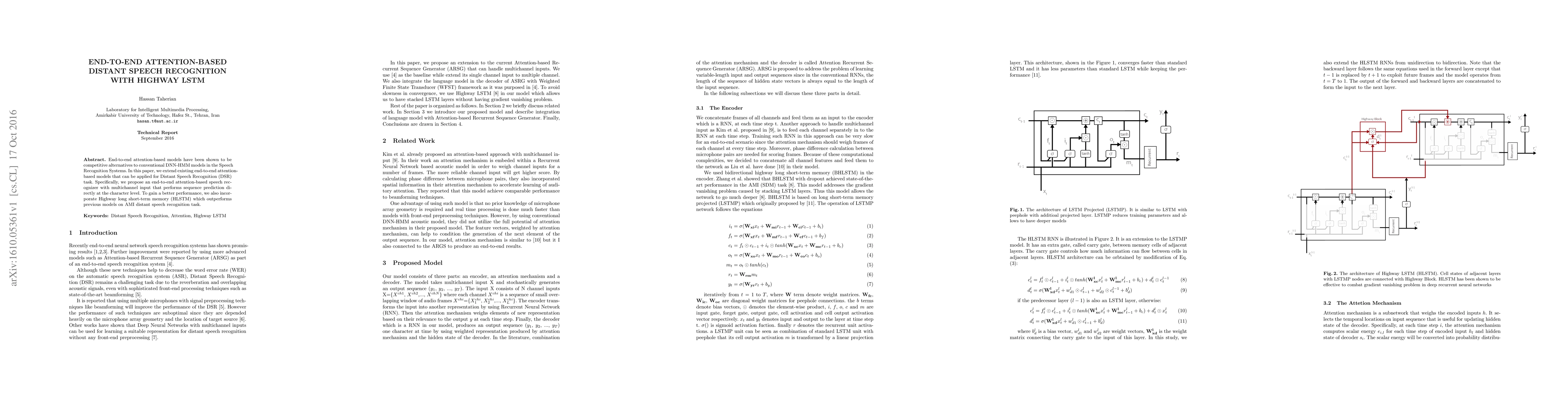 The paper proposes an end-to-end attention-based speech recognizer with multichannel input for distant speech recognition (DSR) tasks, incorporating Highway long short-term memory (HLSTM) to enhance performance on the AMI distant speech recognition task.