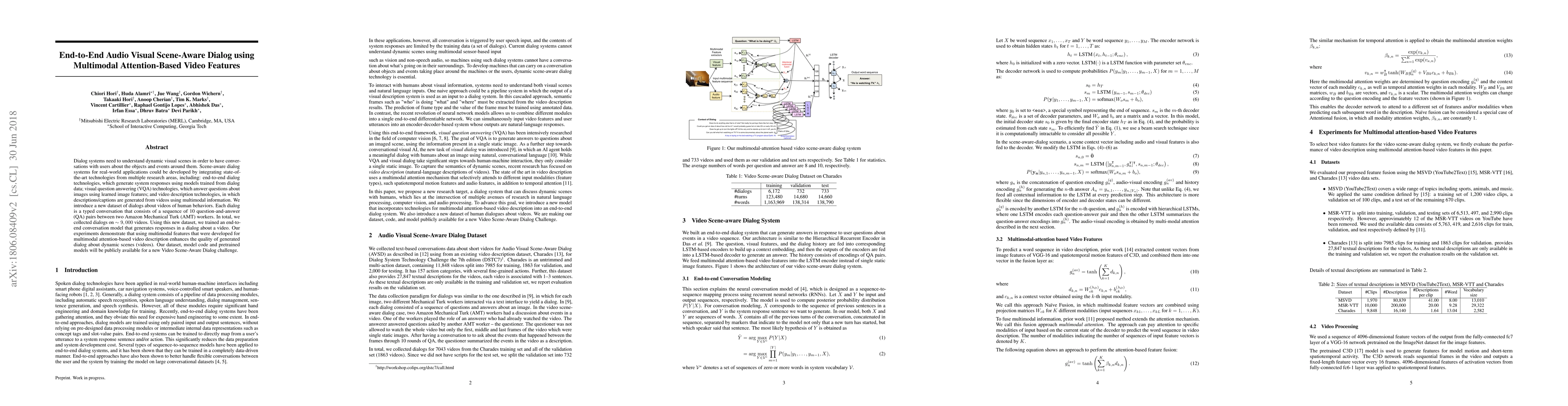 This paper introduces a new dataset for Audio Visual Scene-aware Dialog (AVSD) and presents an end-to-end model that generates scene-aware dialogs about videos using multimodal attention-based video features. The model's performance is enhanced by integrating visual question answering and video description technologies.
