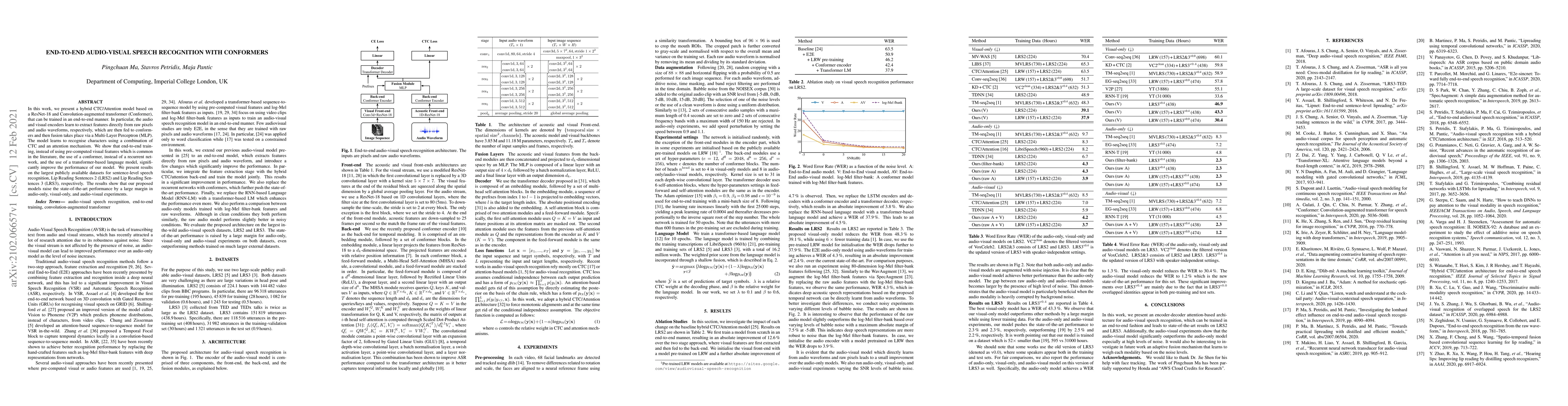 In this work, we present a hybrid CTC/Attention model based on a ResNet-18 and Convolution-augmented transformer (Conformer), that can be trained in an end-to-end manner. In particular, the audio and visual encoders learn to extract features directly from raw pixels and audio waveforms, respectively, which are then fed to conformers and then fusion takes place via a Multi-Layer Perceptron (MLP). The model learns to recognise characters using a combination of CTC and an attention mechanism. We show that end-to-end training, instead of using pre-computed visual features which is common in the literature, the use of a conformer, instead of a recurrent network, and the use of a transformer-based language model, significantly improve the performance of our model. We present results on the largest publicly available datasets for sentence-level speech recognition, Lip Reading Sentences 2 (LRS2) and Lip Reading Sentences 3 (LRS3), respectively. The results show that our proposed models raise the state-of-the-art performance by a large margin in audio-only, visual-only, and audio-visual experiments.