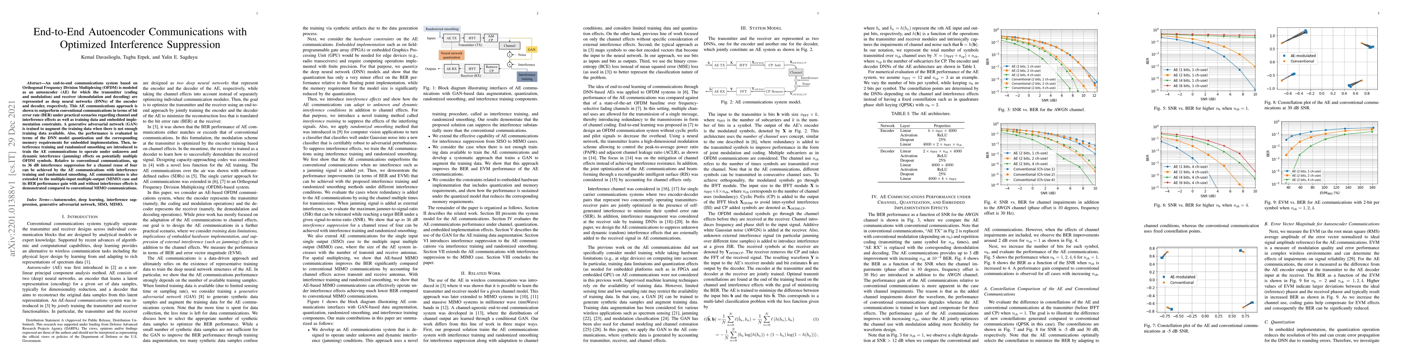 This paper proposes an end-to-end autoencoder communications system based on OFDM, where deep neural networks optimize both transmitter and receiver functions. The approach achieves superior bit error rate performance and up to 36 dB interference suppression compared to conventional methods, especially with interference training and randomized smoothing.