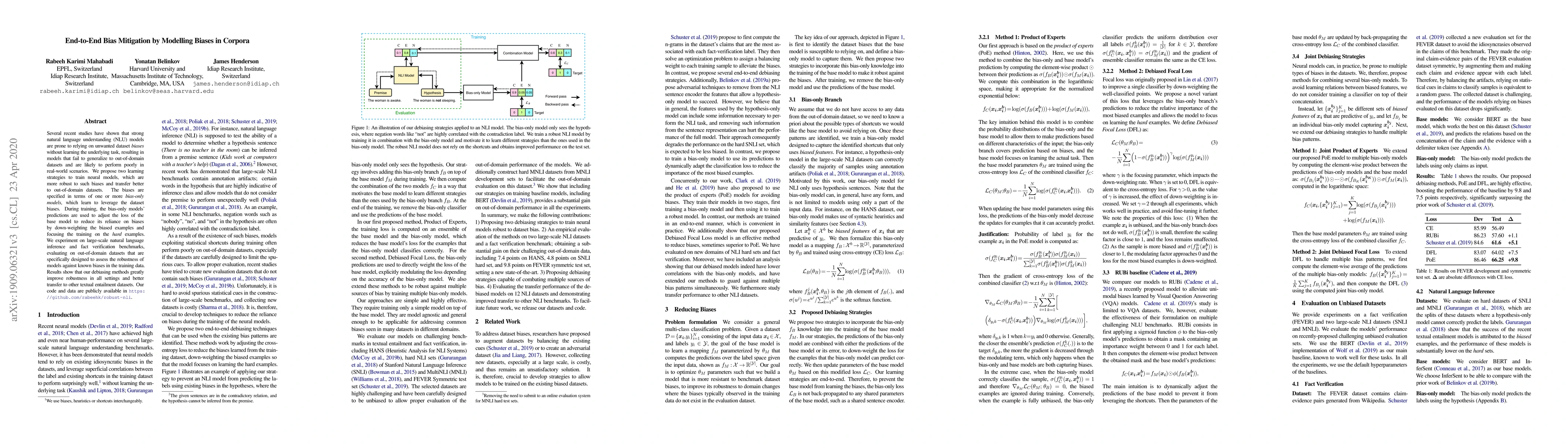 Several recent studies have shown that strong natural language understanding (NLU) models are prone to relying on unwanted dataset biases without learning the underlying task, resulting in models that fail to generalize to out-of-domain datasets and are likely to perform poorly in real-world scenarios. We propose two learning strategies to train neural models, which are more robust to such biases and transfer better to out-of-domain datasets. The biases are specified in terms of one or more bias-only models, which learn to leverage the dataset biases. During training, the bias-only models' predictions are used to adjust the loss of the base model to reduce its reliance on biases by down-weighting the biased examples and focusing the training on the hard examples. We experiment on large-scale natural language inference and fact verification benchmarks, evaluating on out-of-domain datasets that are specifically designed to assess the robustness of models against known biases in the training data. Results show that our debiasing methods greatly improve robustness in all settings and better transfer to other textual entailment datasets. Our code and data are publicly available in \url{https://github.com/rabeehk/robust-nli}.