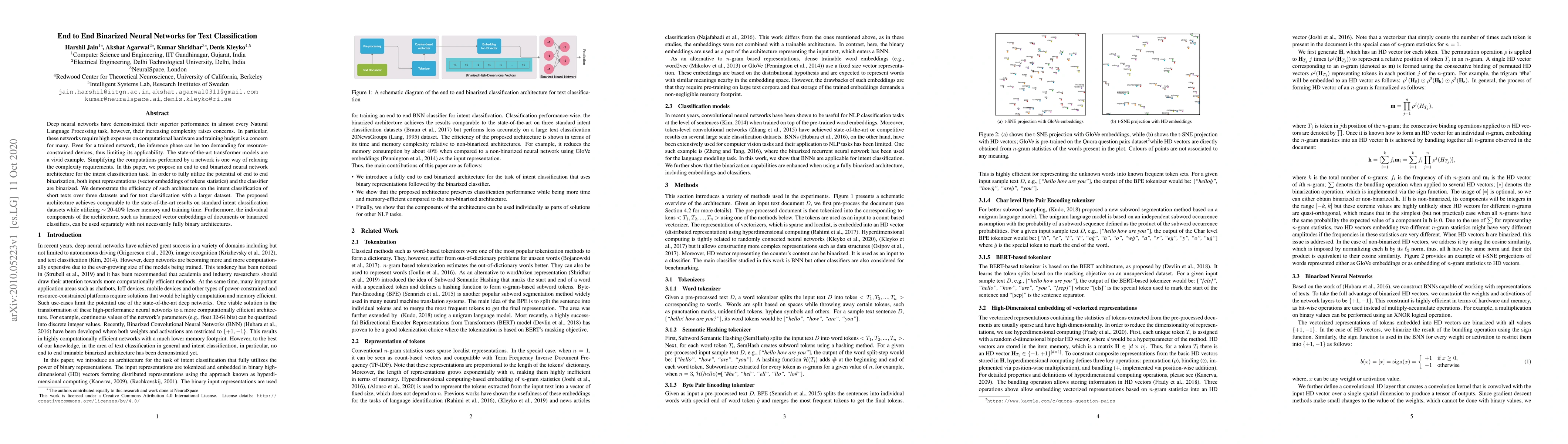 This paper proposes an end-to-end binarized neural network for efficient text classification, achieving comparable performance to state-of-the-art models while using 20-40% less memory and training time, thereby addressing computational and resource constraints. The architecture binarizes both input vector embeddings and classifiers to enhance efficiency.